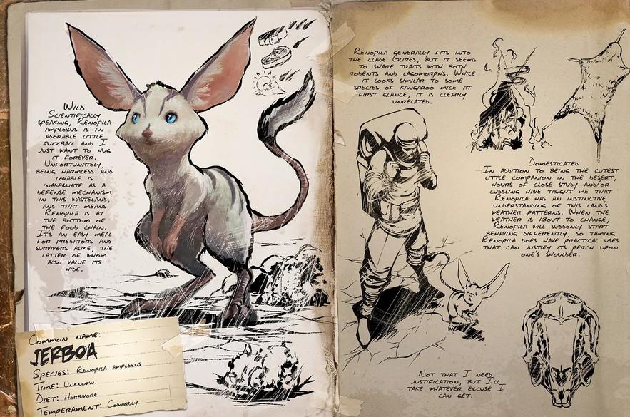 Милейшее создание выженной земли. Приручаемый, совершенно неопасный, но очень трусливый и быстрый. Забавные существа особенно тем, что после приручения могут сидеть на вашем плече. Есть одна полезная странность: предметы в интвентаре тушканчика весят ровно половину от реального веса. Так тушканчик на плече может быть дополнительным рюкзаком. Прирученный тушканчик может сообщать вам об изменениях в погоде своим визгом.