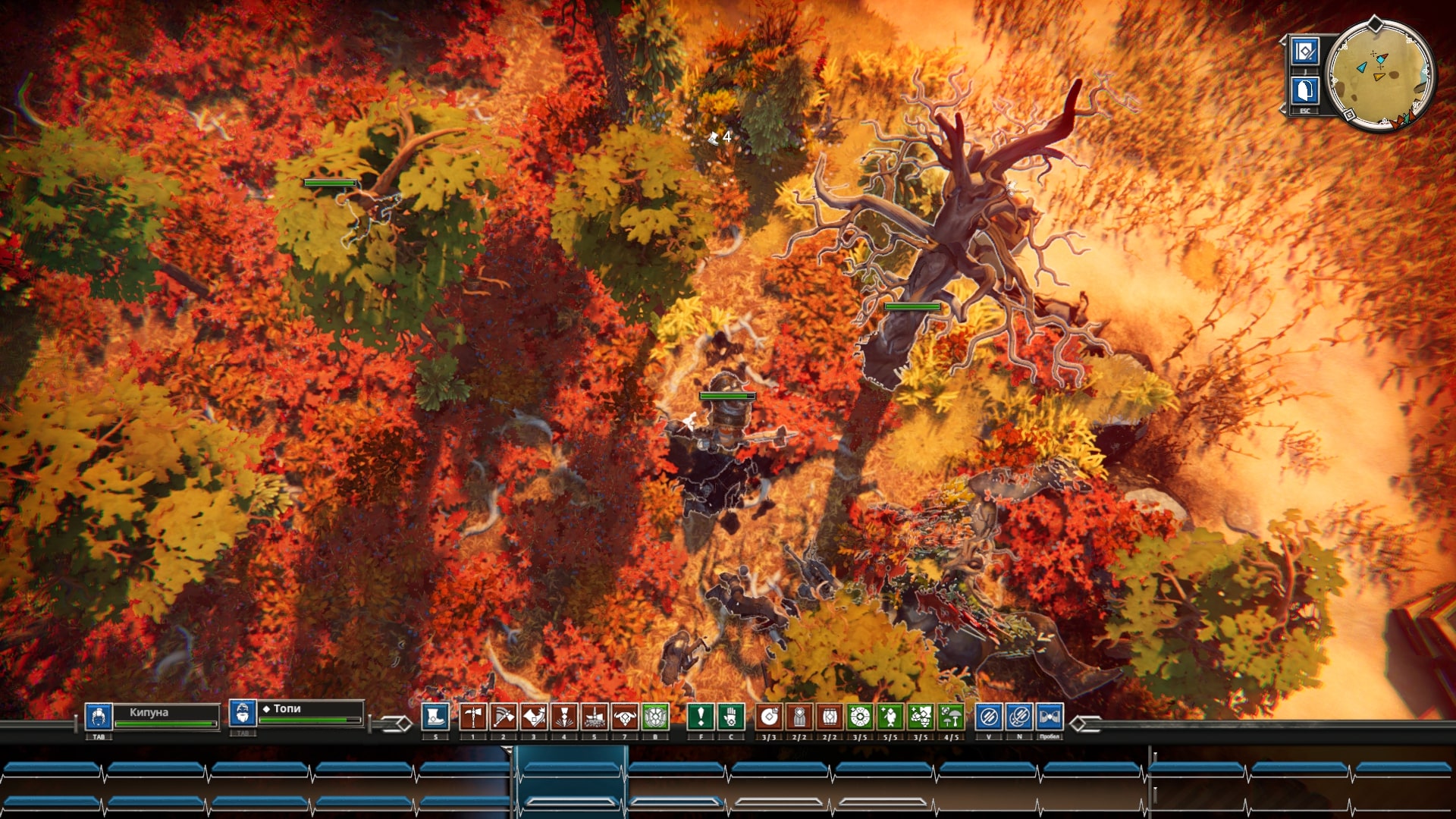 Там активируем первый камень, и входим в зал с центральным рычагом. Тут нас жду сержант, пара механиков, и пара арбалетчиков, закрытые глушилками магии. Не страшно, просто держим Кипуну в стороне, пока Топи расправляется со всеми. Нам не надо убивать всех врагов, поэтому мы просто включаем второй рычаг, и идем за осколком. Внутри сержант, два арбалетчика, гигант с огнеметом и баллиста. Выманиваем их в проход, что бы не мешала баллиста и там взрываем. Забираем осколок, получаем навыки: