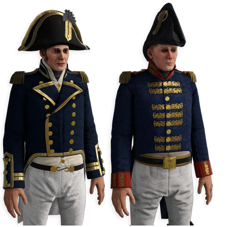 В отличие от своих сухопутных коллег, морские капитаны не имеют возможности издавать приказы. Тем не менее, они имеют приоритет над управлением кораблями. Ниже приведены изображения британских и французских военно-морских капитанов (слева направо).