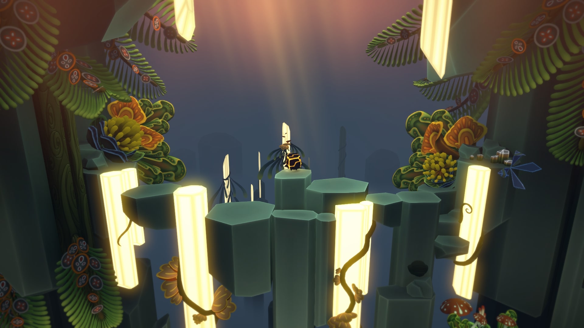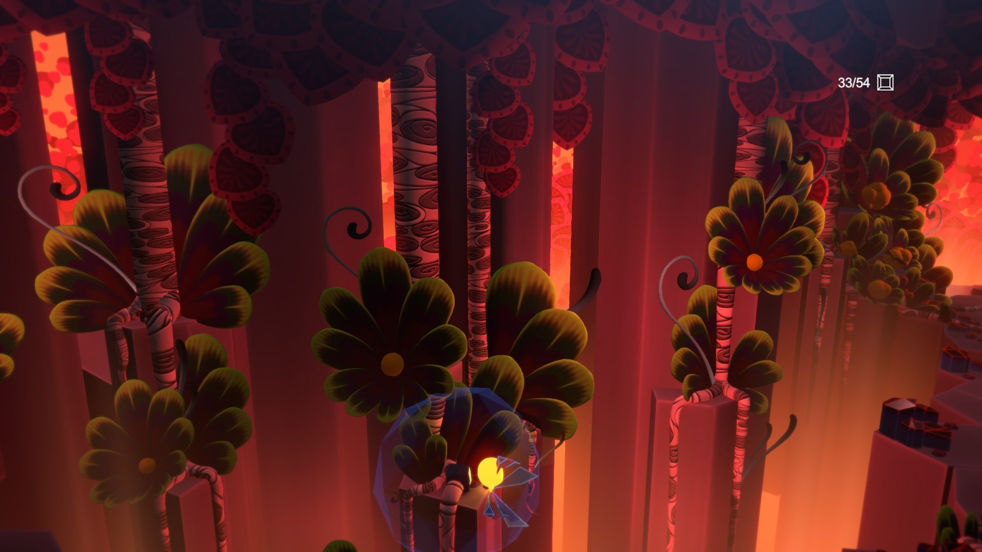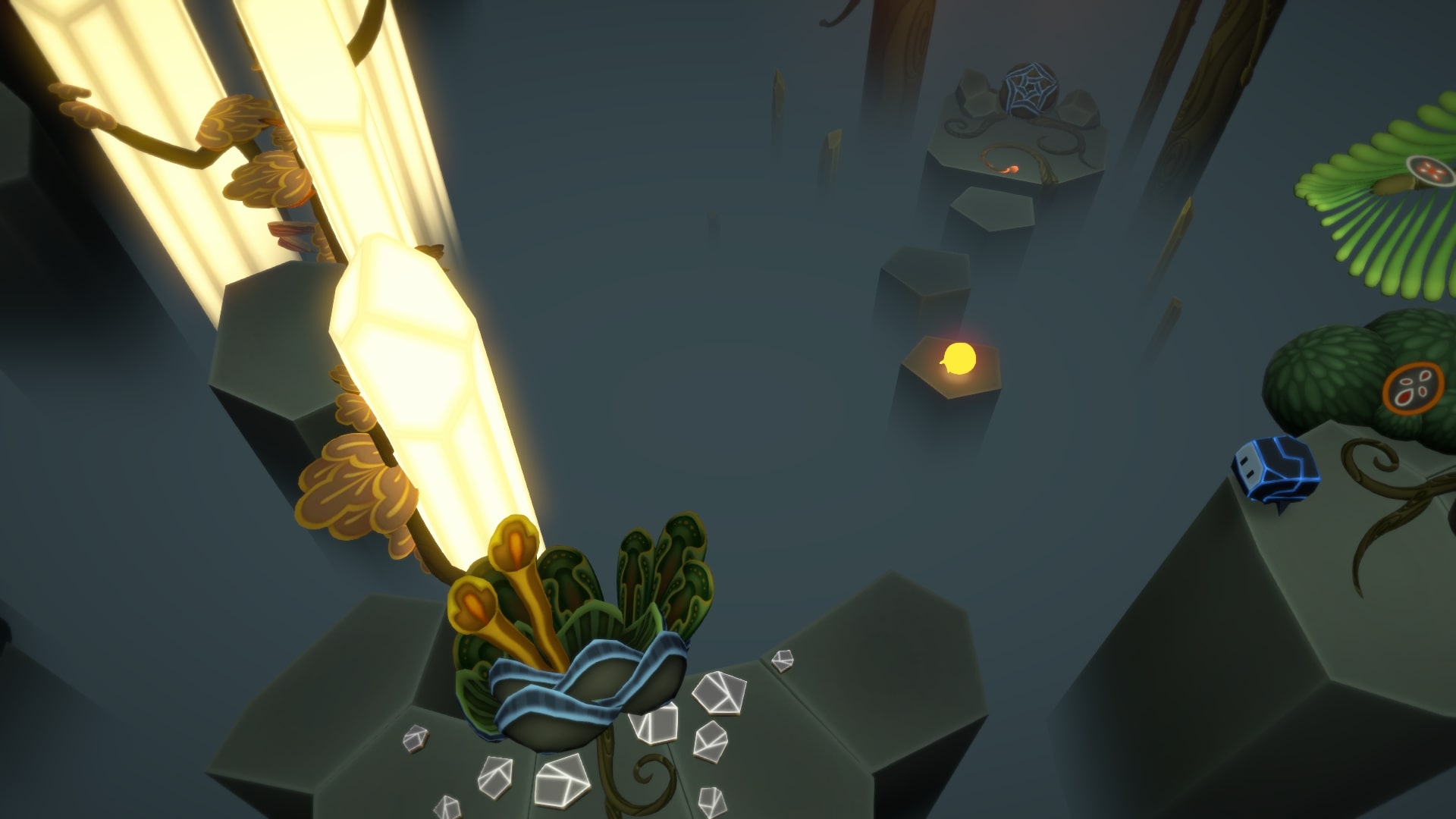 На самом верху справа (после того как цветы распустятся) будет еще один спрятанный кокон. Слева, посередине вдали, на колонне, росток. Съедаем Звезду Камнем, и светим вдаль, на него.