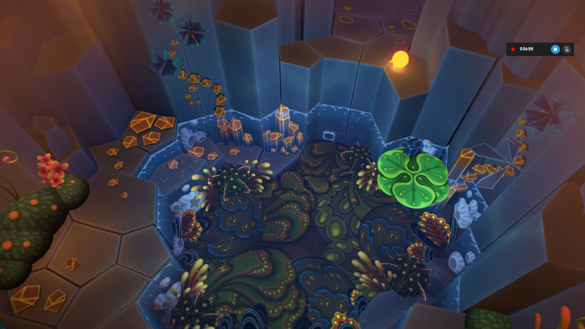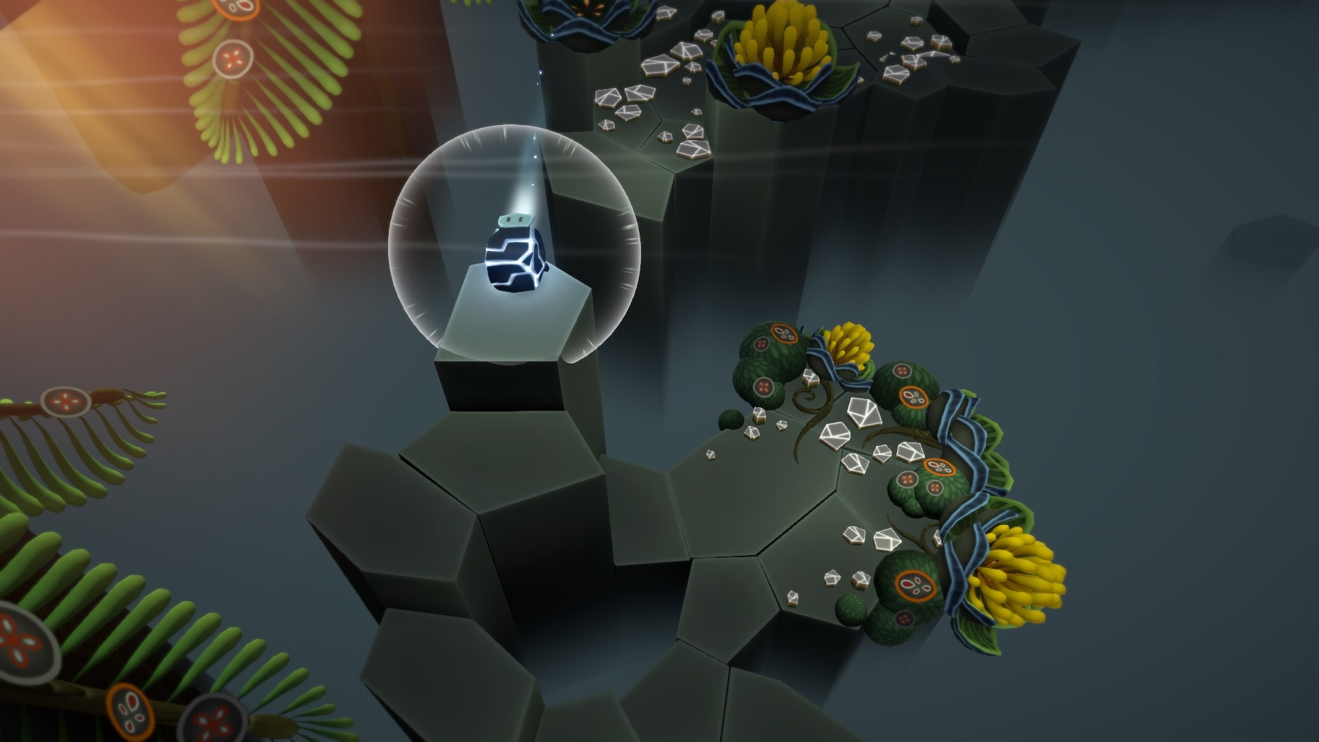 Тут нам показывают то, как наши персонажи реагируют на восходящие потоки. Звезда на этих потоках довольно неплохо может парить. Парим Звездой вдаль, по центру, перемещаем туда Камня с помощью телепортации. Освещаем все ростки и камешки, которые там есть, возвращаемся (можно просто спрыгнуть в пропасть).
