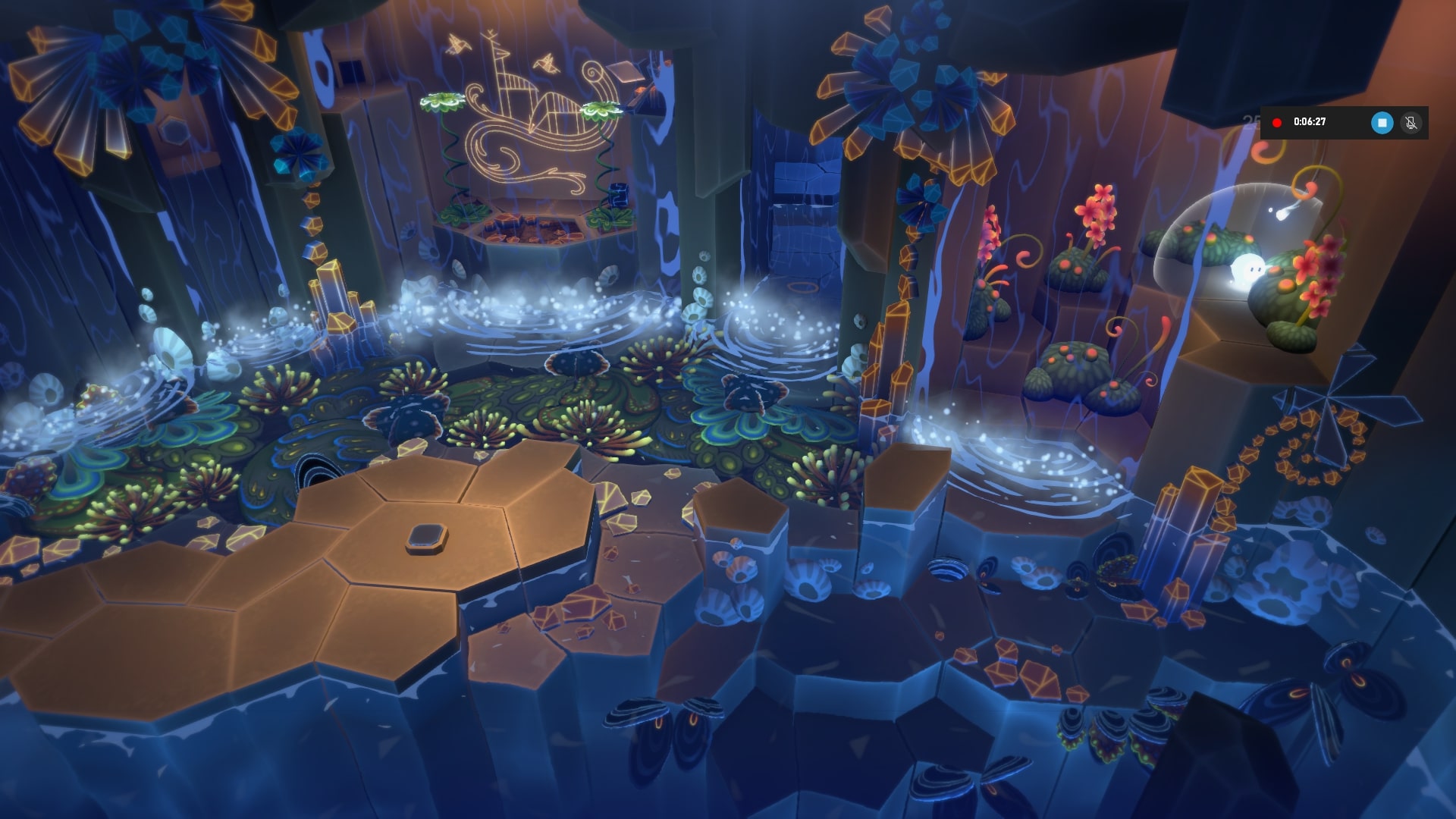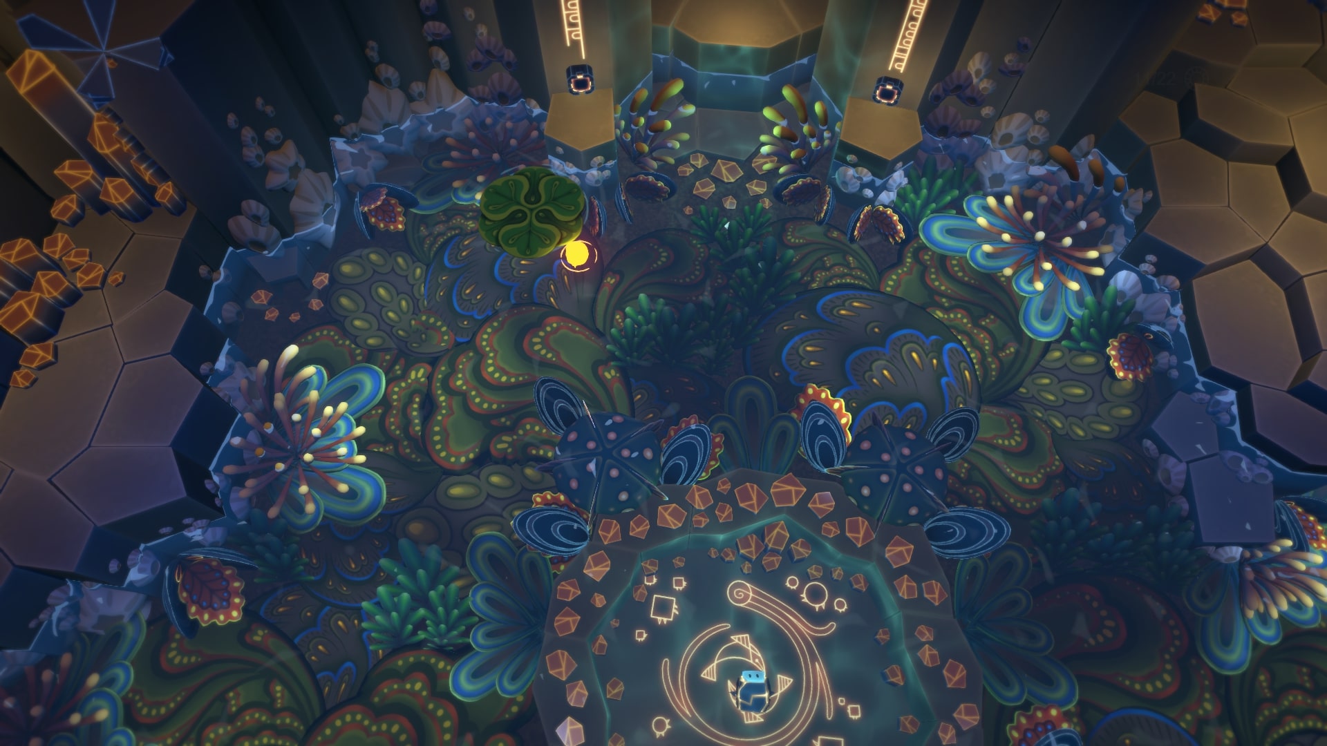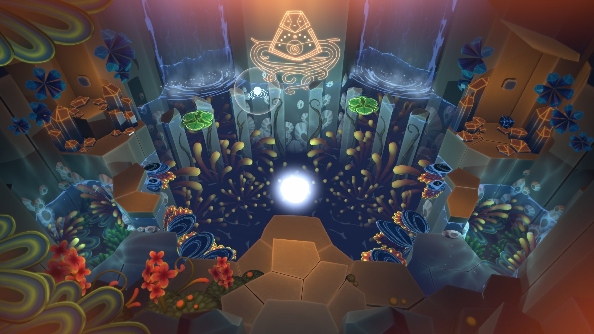 Огромный зал, в котором спрятаны два блока. Нам их надо поднять, и вставить в пазы у водопада на выходе. Осматриваем весь зал, зажигаем бутон с кувшинкой справа, и перемещаем блоки к водопаду. Тут много хитрозапрятанных секретов. Один блок сначала надо закинуть в центральный атолл (сработает если вы его осветили Звездой).