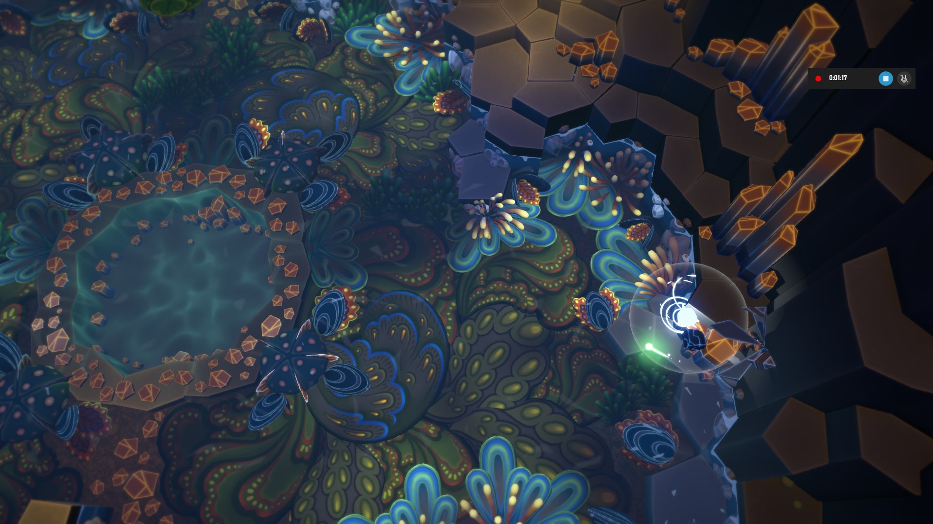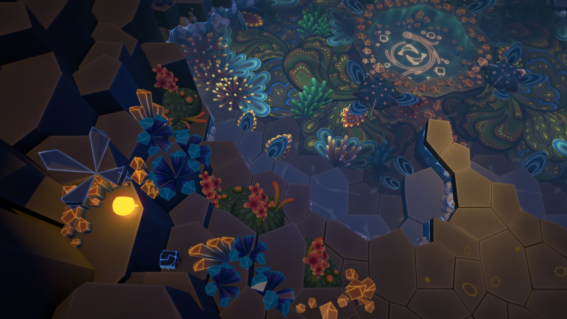 Тут появляется местный аналог кувшинок. Нам надо светить (вместе с камнем не работает) на бутон в воде. Запрыгиваем на кувшинку Камнем, толкаем ее свечением Звезды. Переплываем пруд. С Камня запрыгиваем на скалы, бросаем свечение и телепортируем туда Камень. Что бы форсировать следующее озеро нам надо сначала стать Камнем на кнопку. Теперь Звезда может добраться до бутона. Открываем кувшинку, и плывем к правой стенке. Там есть кокон.
