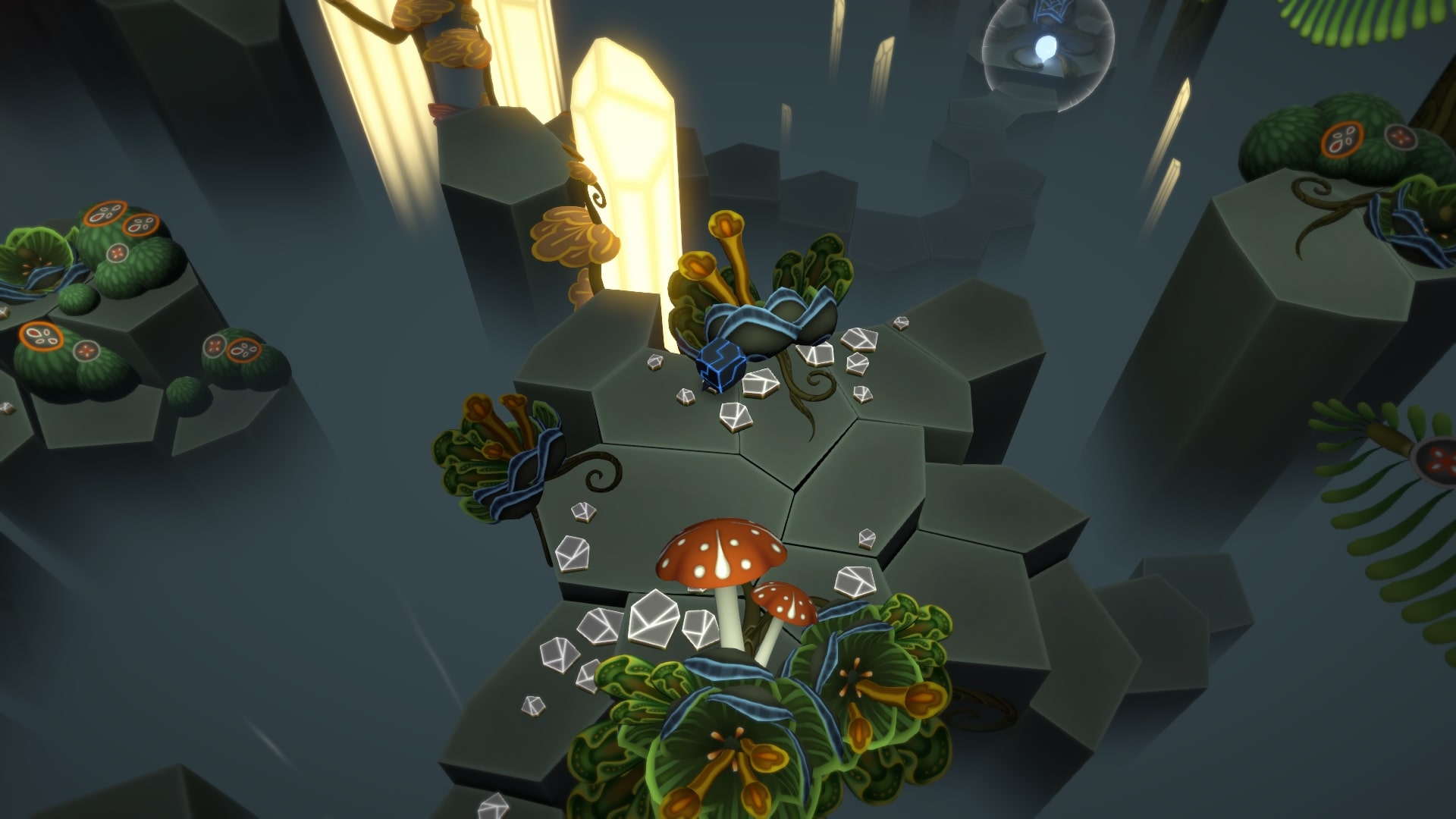 Оказавшись на этаже, ставим тут свечение, и спускаемся, телепортируем камень сюда. Нажав на шестигранную панель слева, скалы изменят положение, и теперь можно спокойно подниматься-спускаться без проблем. На среднем этаже, в самом конце, справа, есть кокон-секрет. Забираем.