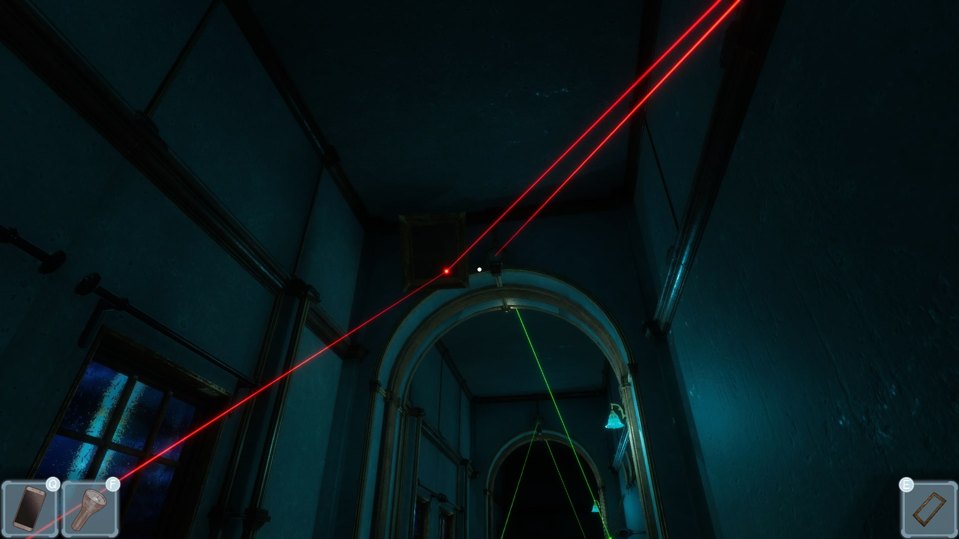 Коридор разбит на три части, в каждой надо направить луч на центр притолоки, и тогда луч пойдет дальше. В третьей комнате зеркало надо направить сначала почти полностью назад, а потом ловить луч. Тут лежит предмет-зеркало, но он нужен только для коллекции. Лучу он не поможет.