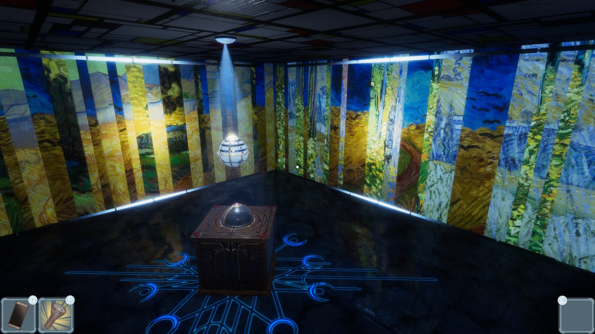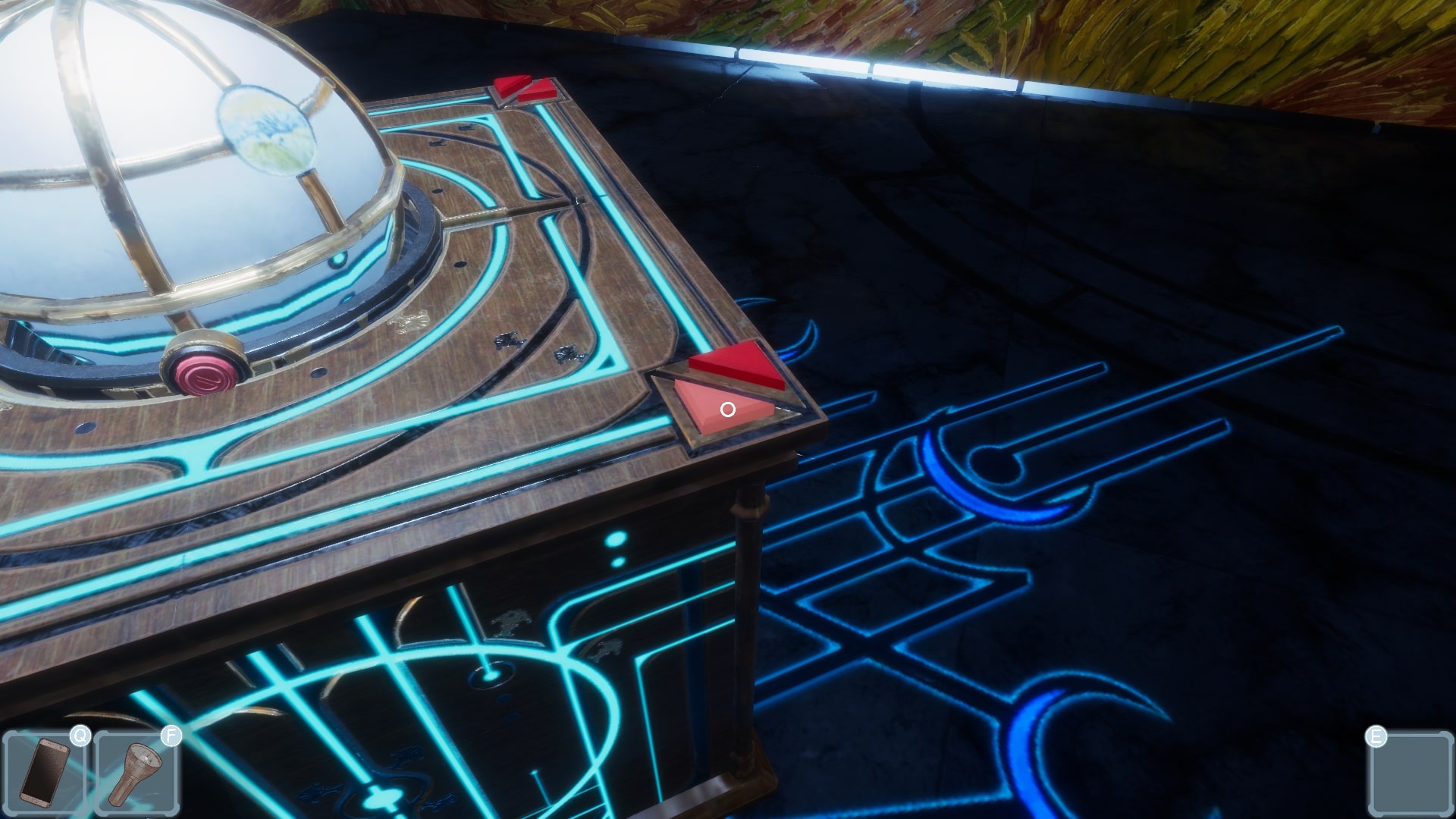 На куполе в центре сверху есть кнопка. Нажимаем, купол разворачивается, внутри оказывается интересной формы, стальной держатель. Забираем. Опускаем сферу, которая парит над вами, она встает в углубление, и сверху втыкаем держатель. Сфера поворачивается к нам подсказкой, а картины выравниваются. Теперь надо правильно их расставить.