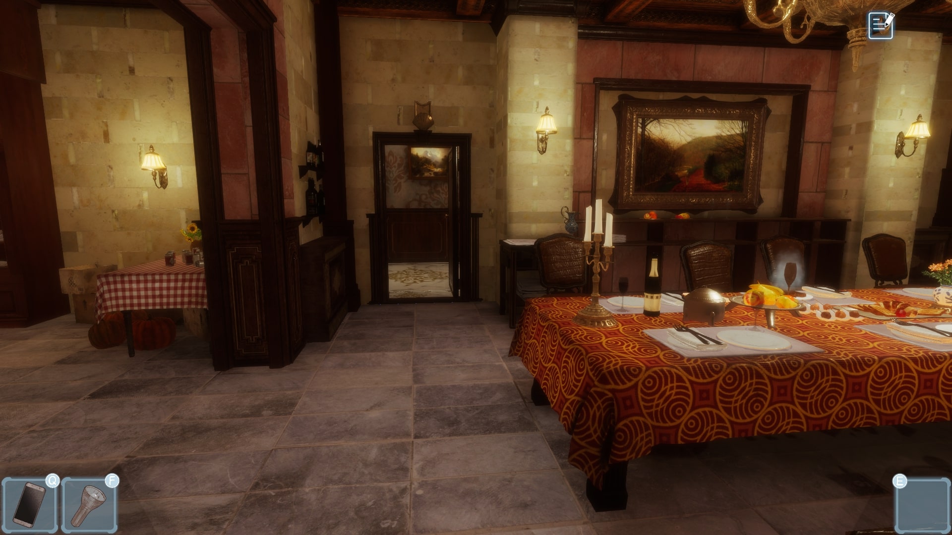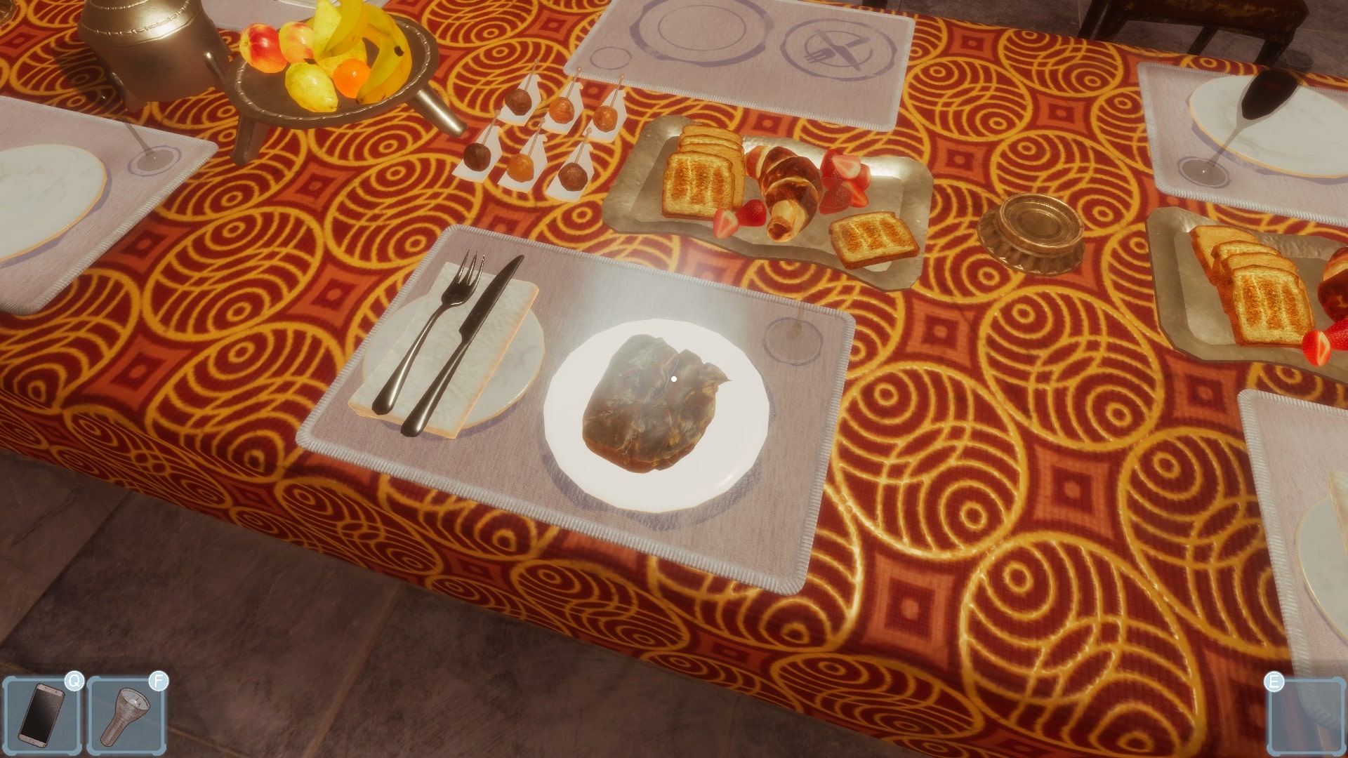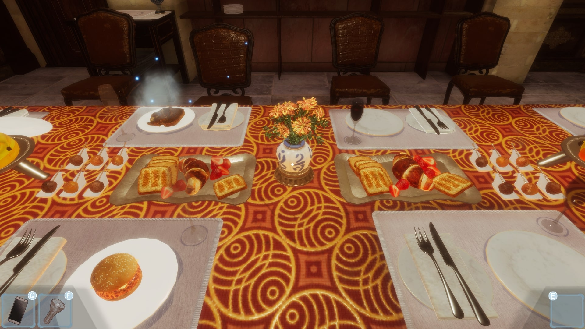 Какие именно блюда нужны- будет выделено в сообщениях красным. Сервируем стол. Нужна подставка (они около двери). На нее кладем блюдо с едой, тарелку с приборами, и ставим бокал. Так же на стол, по краям ставим подсвечники, а в центр стола ставим вазу.