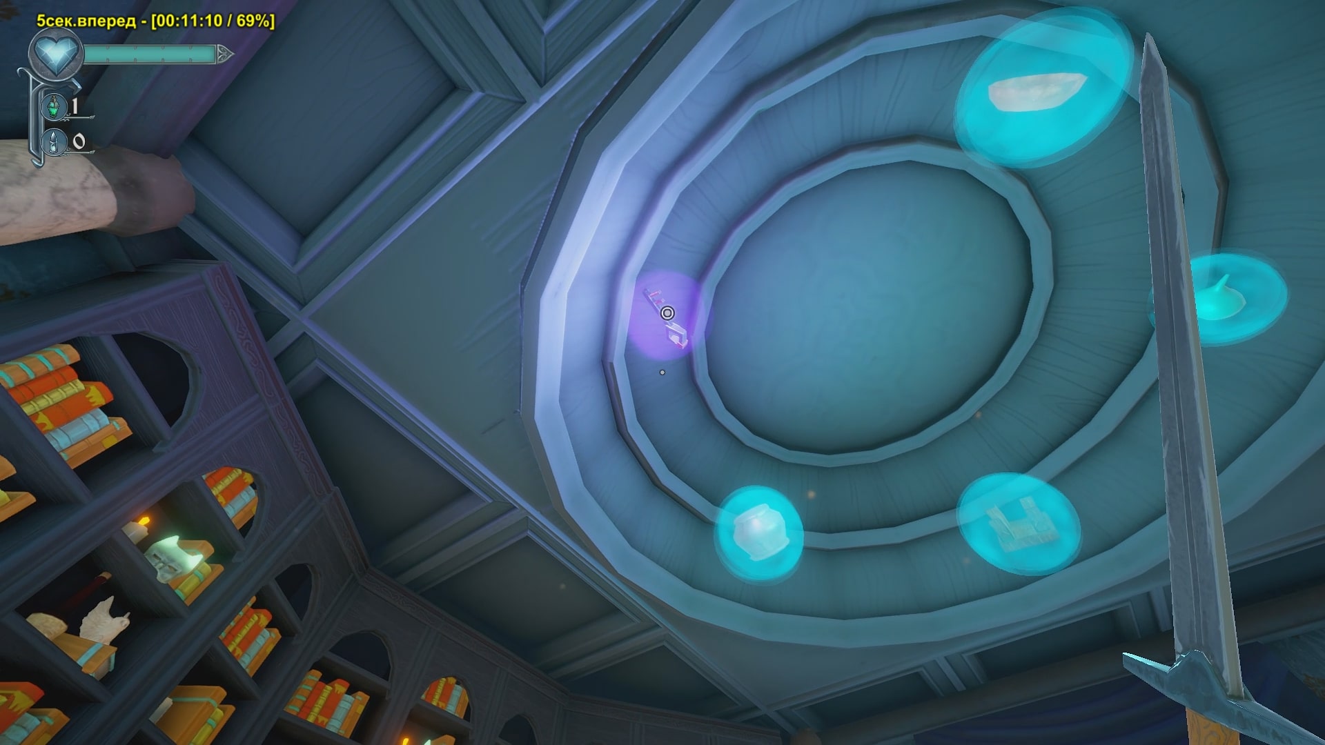 Заходим в дом. Заходим направо в комнату с камином, зажигаем его, поворачиваем сов друг на друга, забираем рецепт “геральдика” со стола, и меч в открывшейся нише (переключаем меч в инвентаре). Идем налево, за ящиками забираем ключ