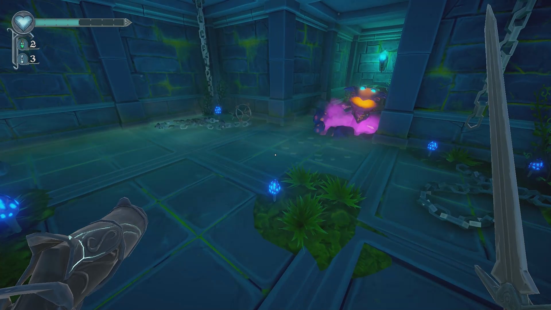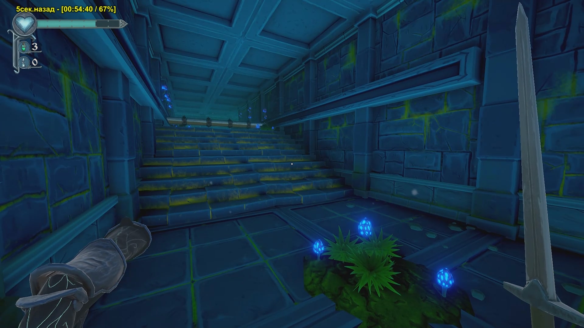 Забираем одну в сундуке в комнате слева. В левом коридоре на земле еще одна. Одна прям перед воротами. Последняя статуэтка спрятана за кубом, в нише, в правом коридоре. Вставляем их, и проходим вперед. По левую руку можно увидеть растения, которые мешают проходу, но пока у нас нет меча, мы там не пройдем (за ними синий цветок и гриб). Идем прямо в форт.
