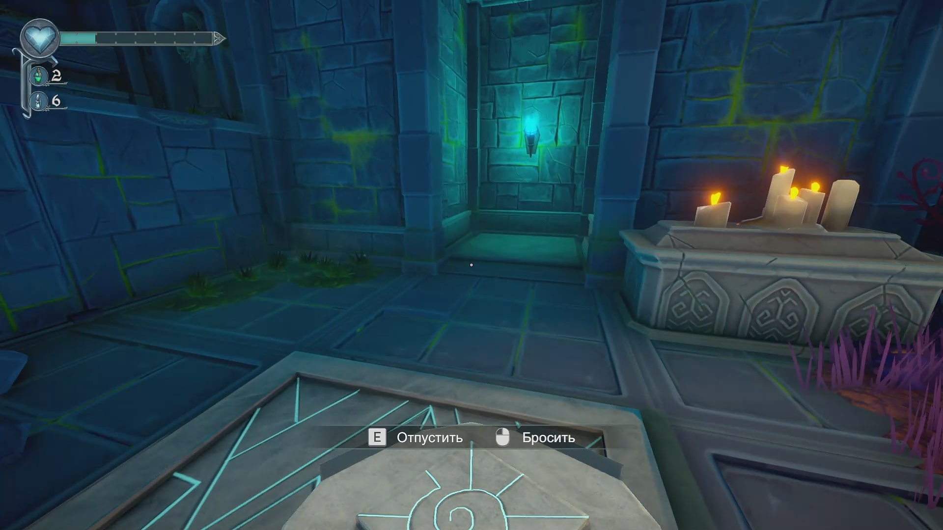 Возвращаемся в зал, кидаем блок на самую дальнюю кнопку, забираем первый блок, встаем на плиту, и кидаем на кнопку рядом. Проходим вперед и активируем кристалл.