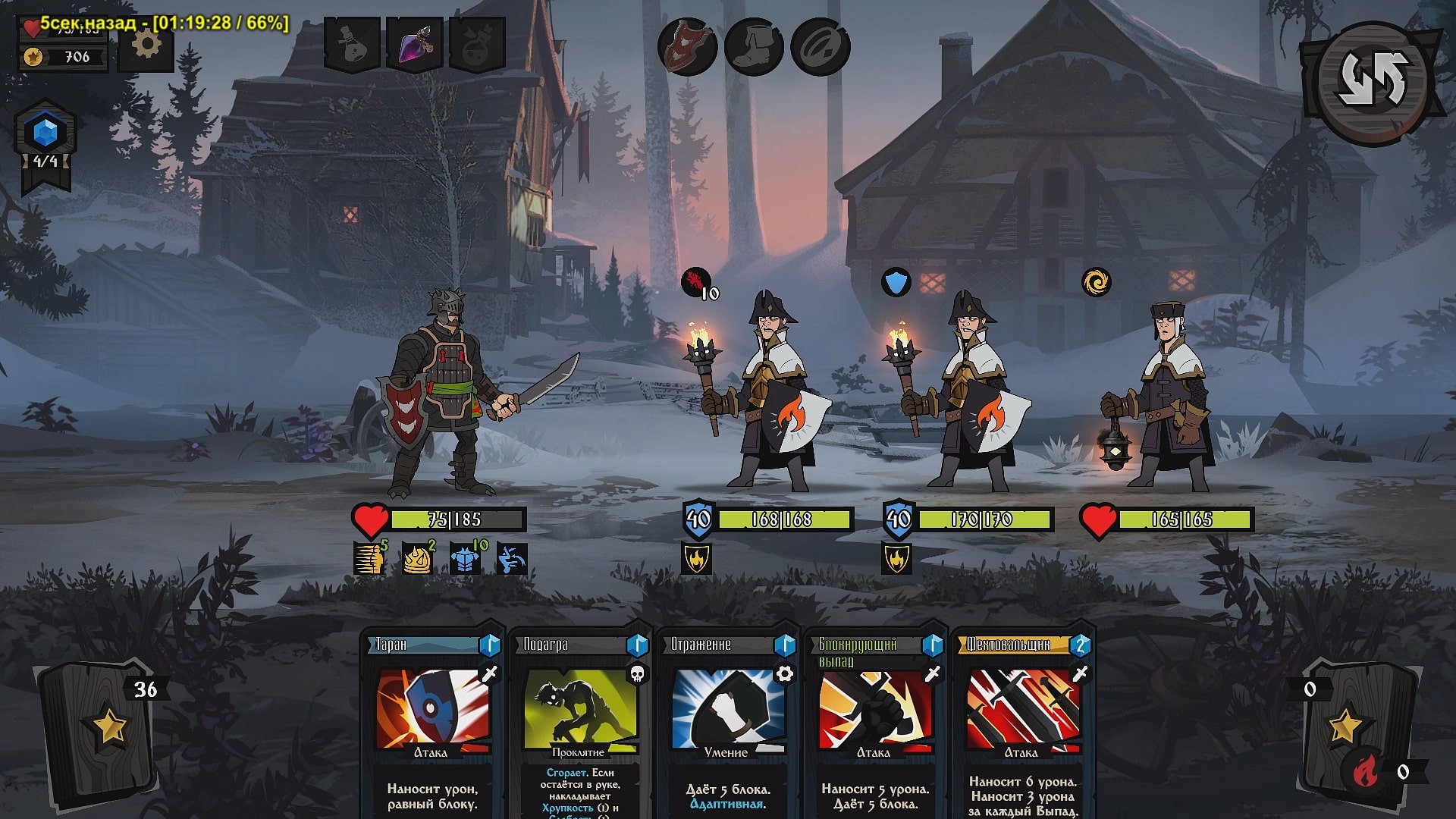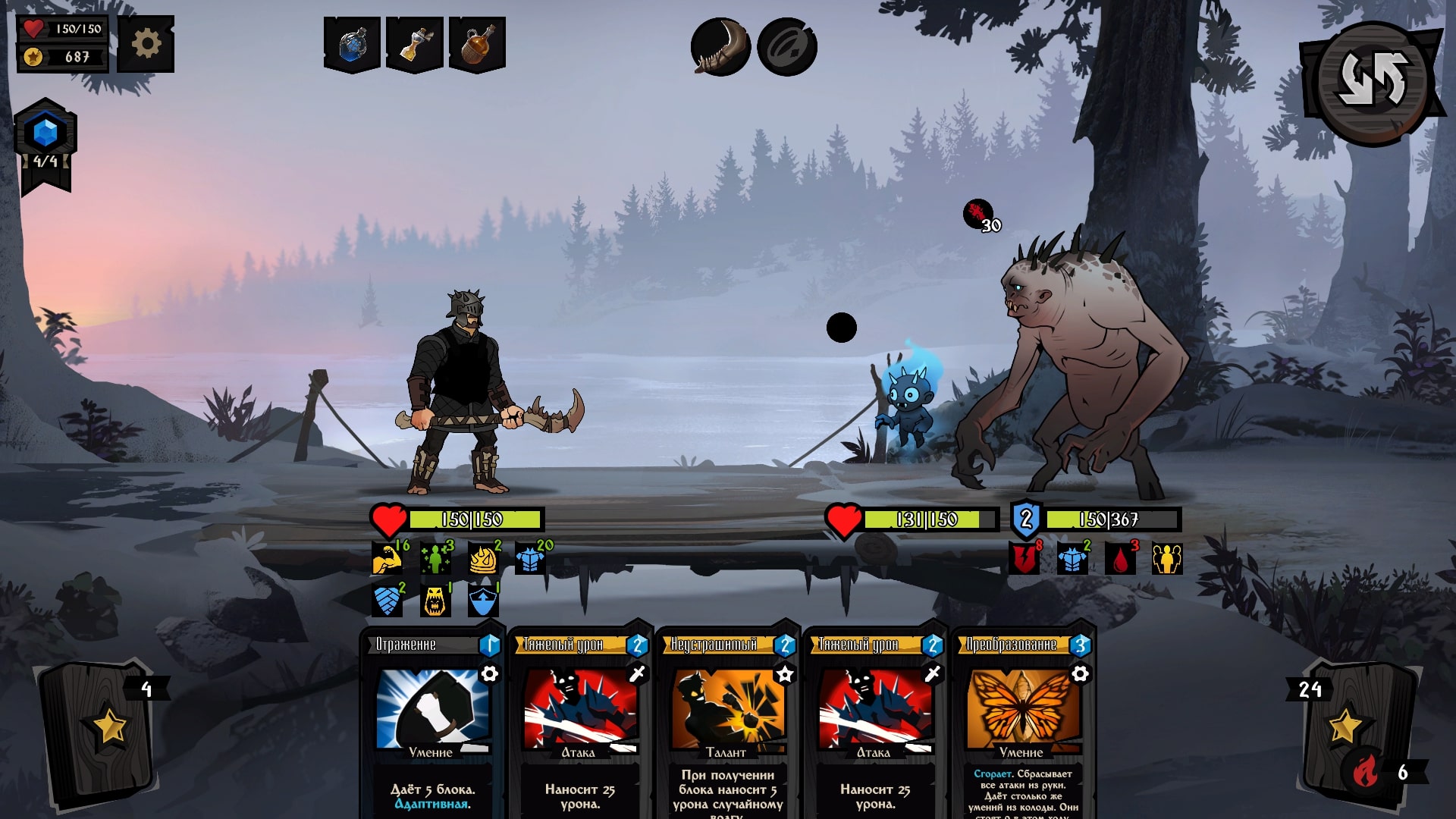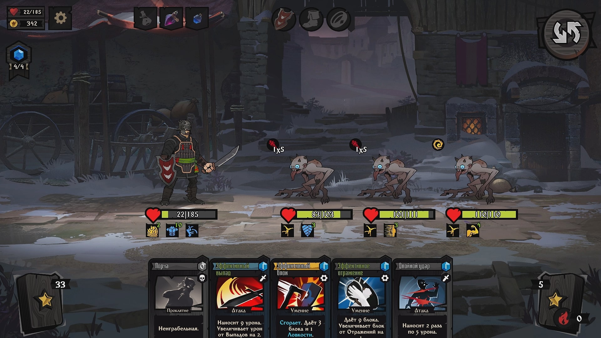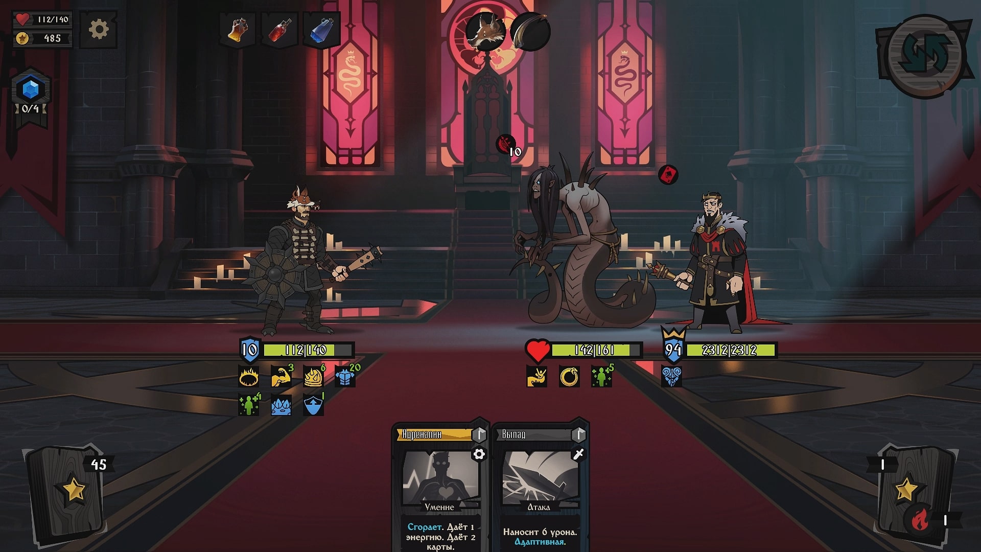 - Страх (каждый ход забирает случайную карту. При получении 100 урона за один ход, возвращает 1 карту)
