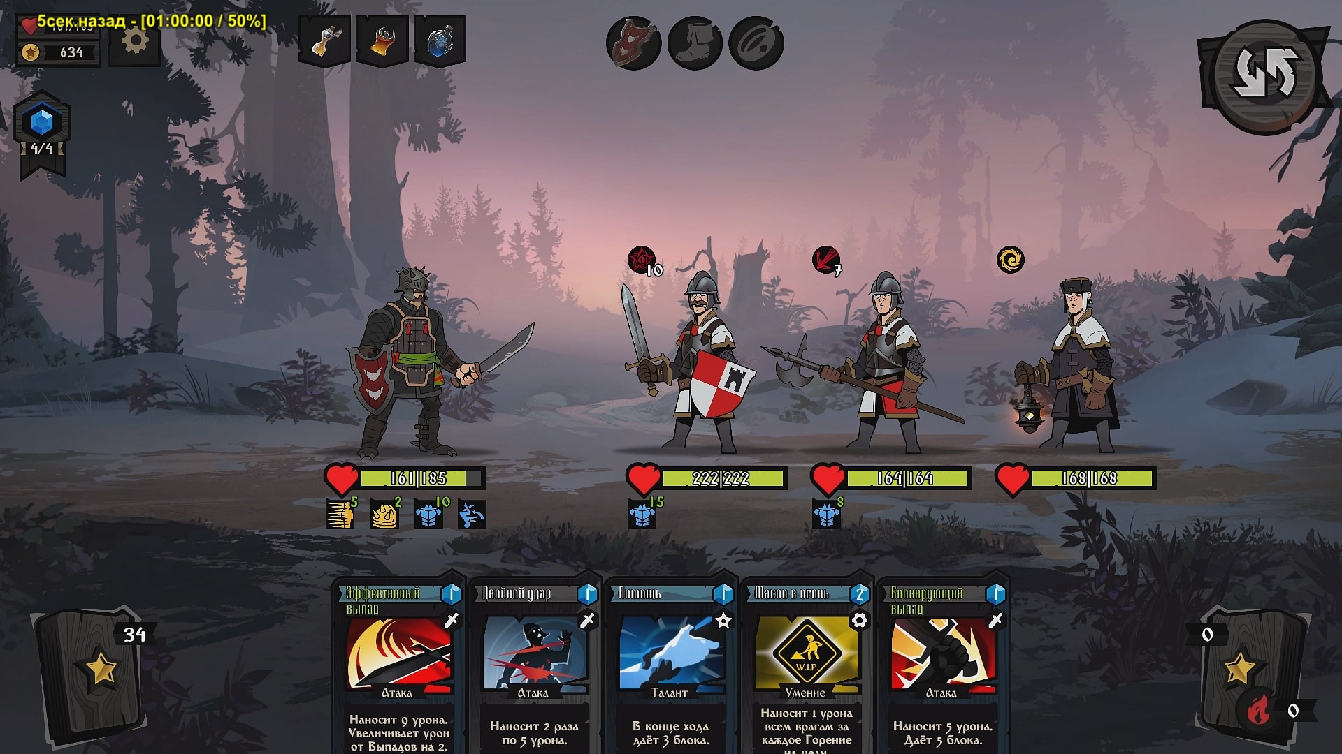 - Горение (Наносит урон за каждое Горение. В конце хода снимает 50% горения, и замешивает карту Ожог)