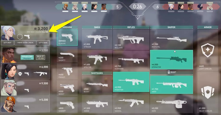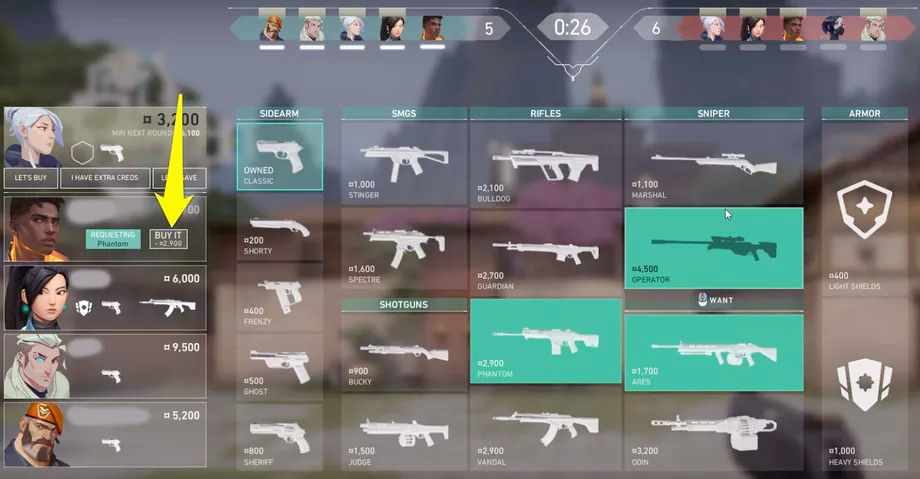 В начале каждого раунда идет фаза покупки, где вы можете приобрести различные предметы, используя внутриигровые деньги, которые называются кредитами. Они зарабатываются во время предыдущих раундов.
