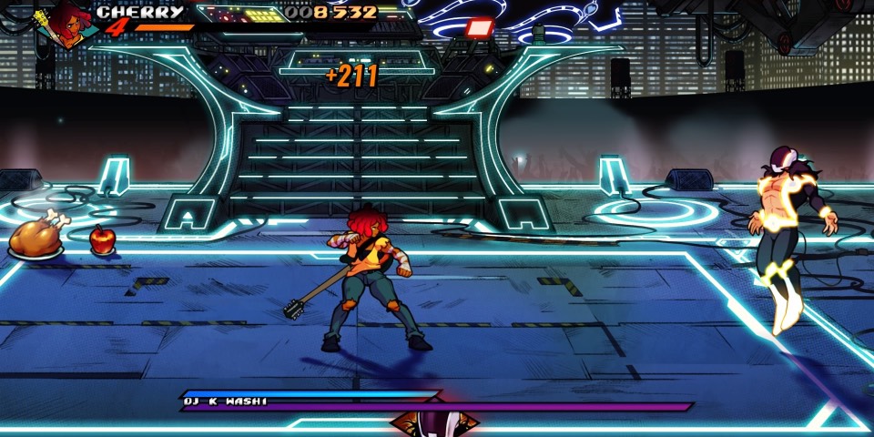 DJ K Washi защищен, так что вам нужно будет ломать защиту, прежде чем нанести урон его здоровью. Защита восстанавливается автоматически. Основные атаки диджея включают в себя диски, которые он будет кидать. Вы поймёте когда нужно уклонится - диджей засветится зелёным.. Он также будет стрелять голубыми энергетическими зарядами по прямой линии, поэтому уходите с пути, когда диджей светится синим. И когда он вспыхнет красным, он выстрелит сильнее.
