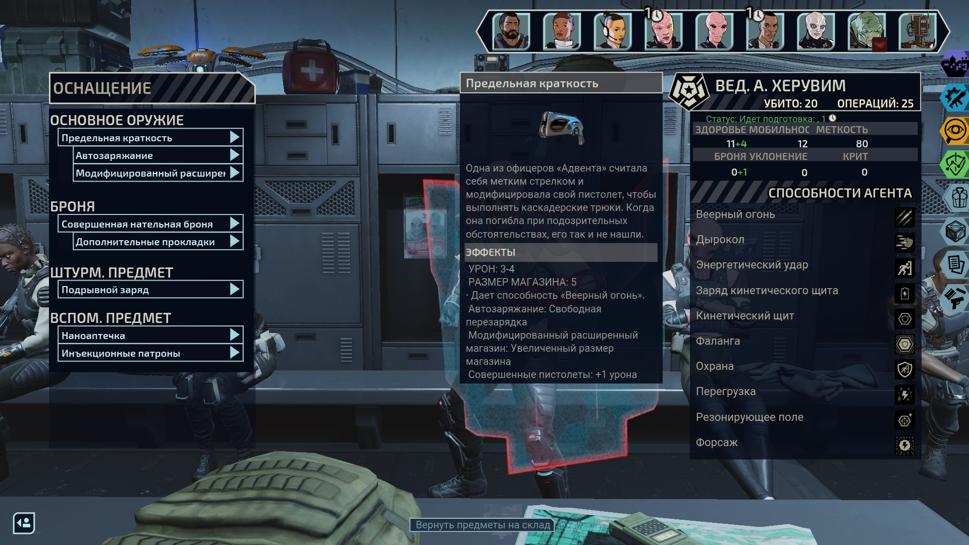 - Предел возможностей. Использовать можно только один раз за миссию. Крёстная получает бонус к уклонению от выстрелов и вероятность нанести критический урон, а спустя три хода получает дополнительный ход. ОД для выполнения не требуется.