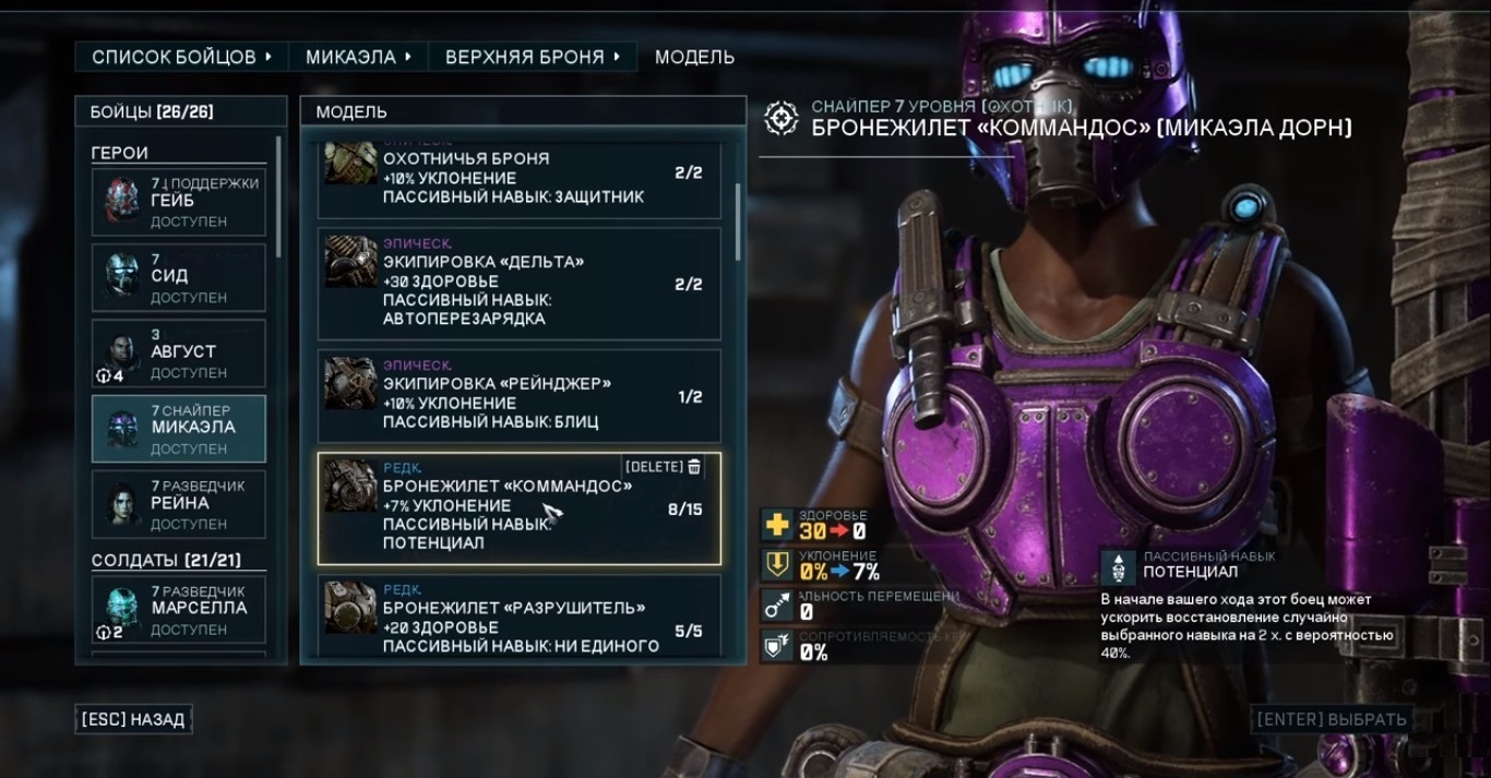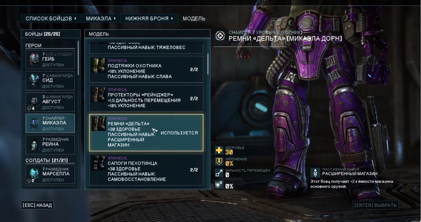 Большинство доступных модов брони для Снайперов дают великолепные эффекты, такие как: «повышенный шанс крита» или «урон», которые не совсем жизненно важны. Но самый ценный мод - это мод для ног, который дает вам размер магазина +1, что делает Снайпера еще более смертоносной машиной для убийств, поскольку вам не придется тратить действия на перезарядку.