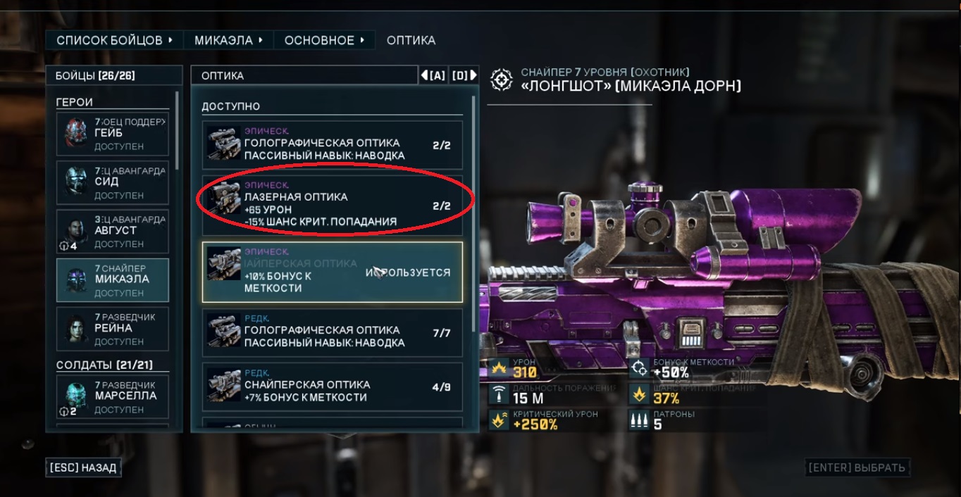 Прицел: увеличенный урон, но пониженный шанс критического удара, который компенсируется модификацией магазина.
