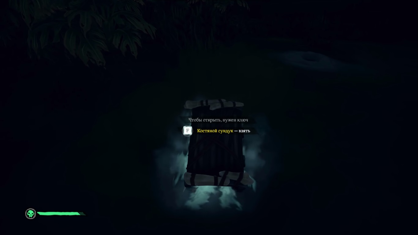 Пройдя чуть дальше по следам скелета, вы увидите, как нежить всё так же забирает какой-то предмет с тела пирата и закрывает свою находку в сундуке, который, конечно же, просто так на месте не оставили. Этот сундук скелеты тащат вдвоём.