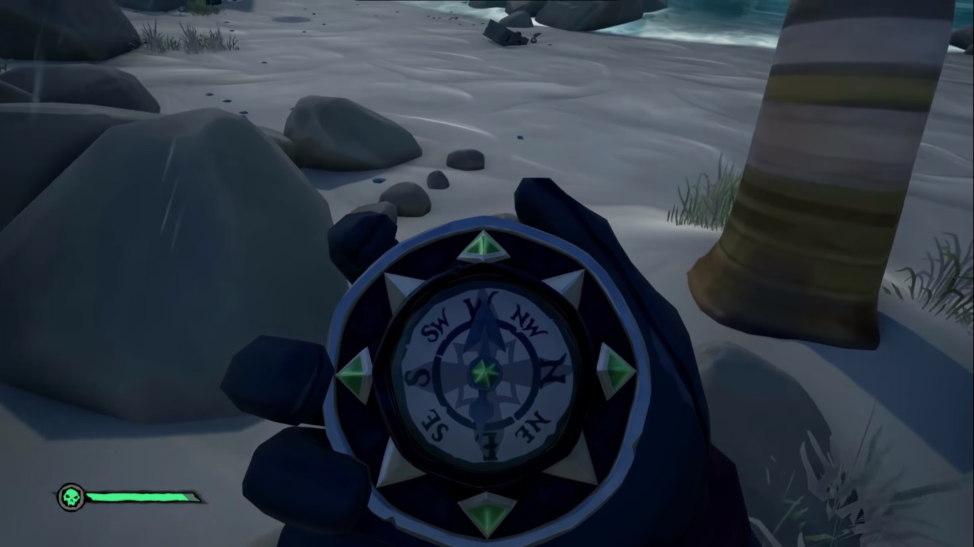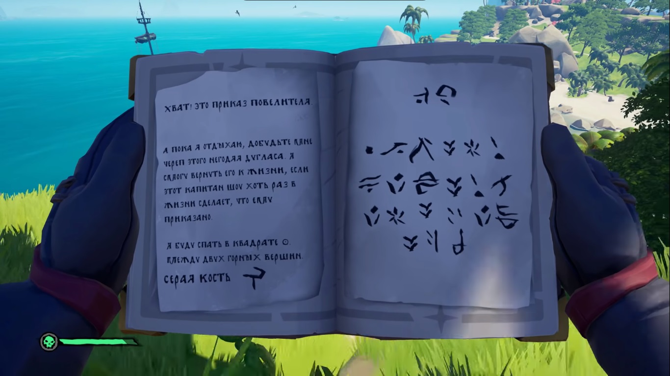 Кроме того, из записки другого пирата становится понятно, где зарыт сундук с формой членов экипажа – он зарыт между пальмой и утёсом. Найти это место довольно легко.