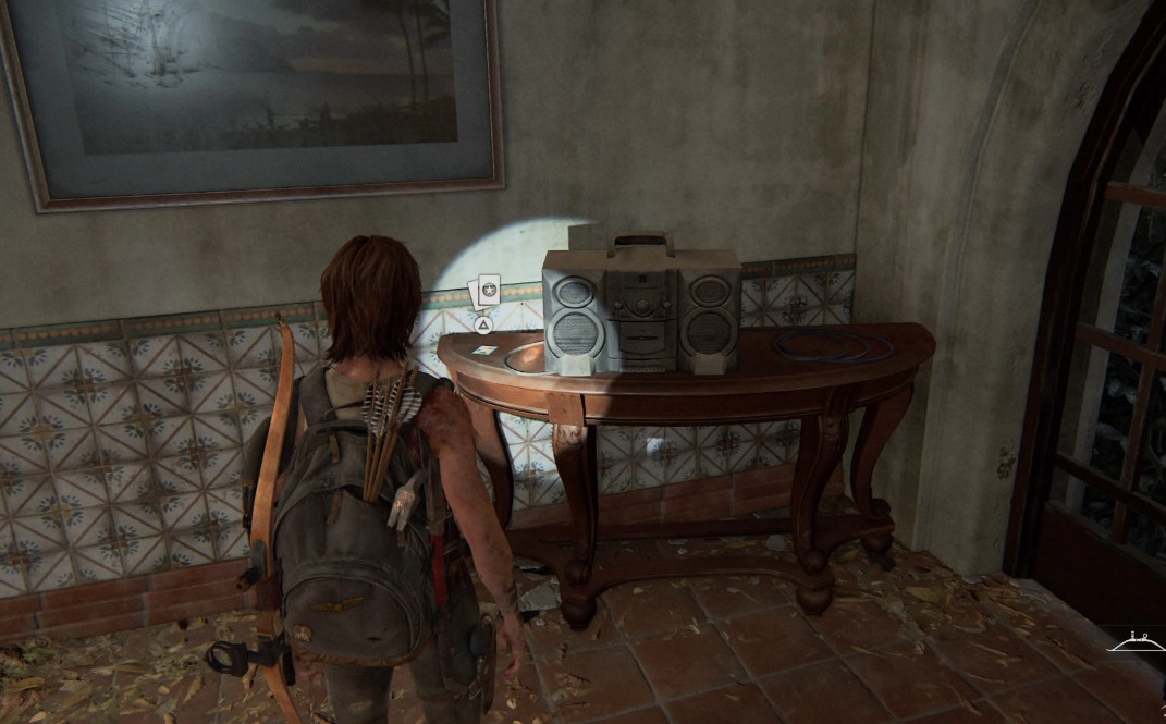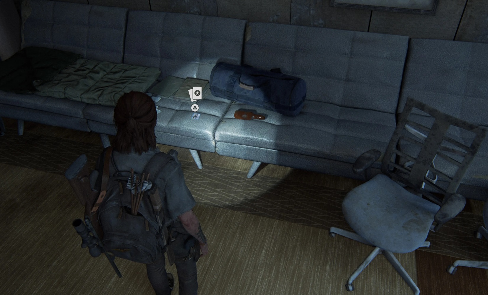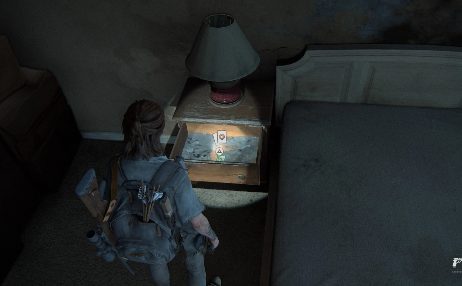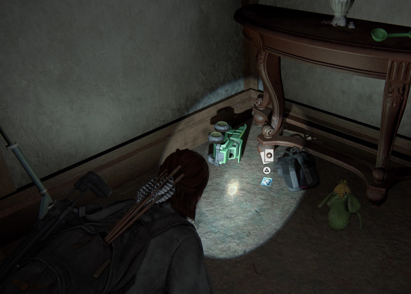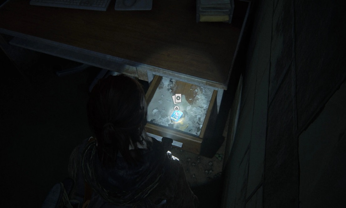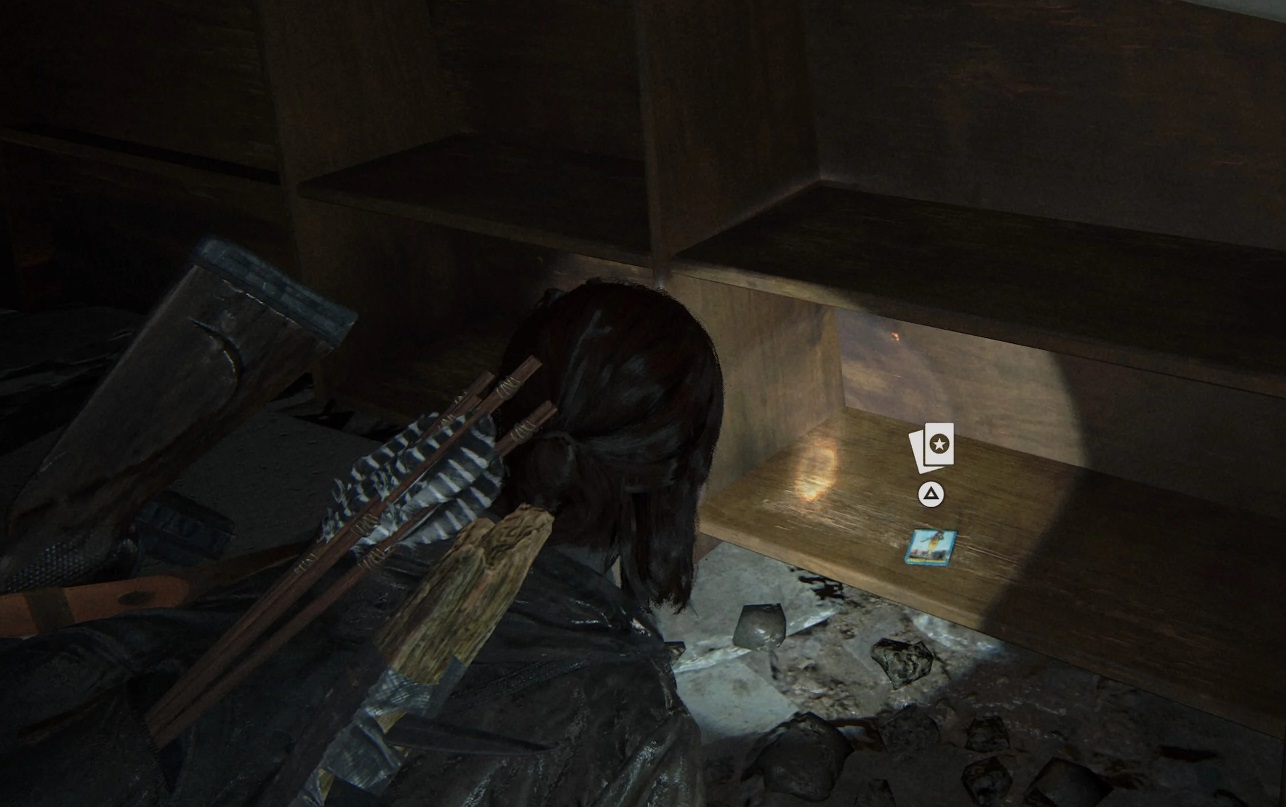 Tanager – Элли должна прийти в книжный, там она раздобудет коллекционный предмет среди опустевших полочек с книгами (которых уже, естественно, нет). Чтобы попасть в комнату с полками, нужно снова пролезать ползком.