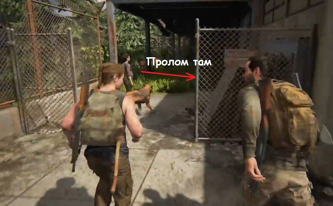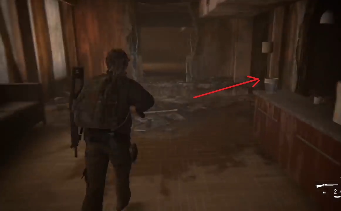 Когда Лев и Яра пойдут спать, отправляйтесь через склад в помещение, где увидите верстак. Когда встанете так, как показано на скриншоте выше, перелезьте через забор. Далее просто заходите с левой стороны здания, и всё время двигайтесь вперёд, держась левой стороны. На столе вас будет ждать ремень для дополнительной пушки.