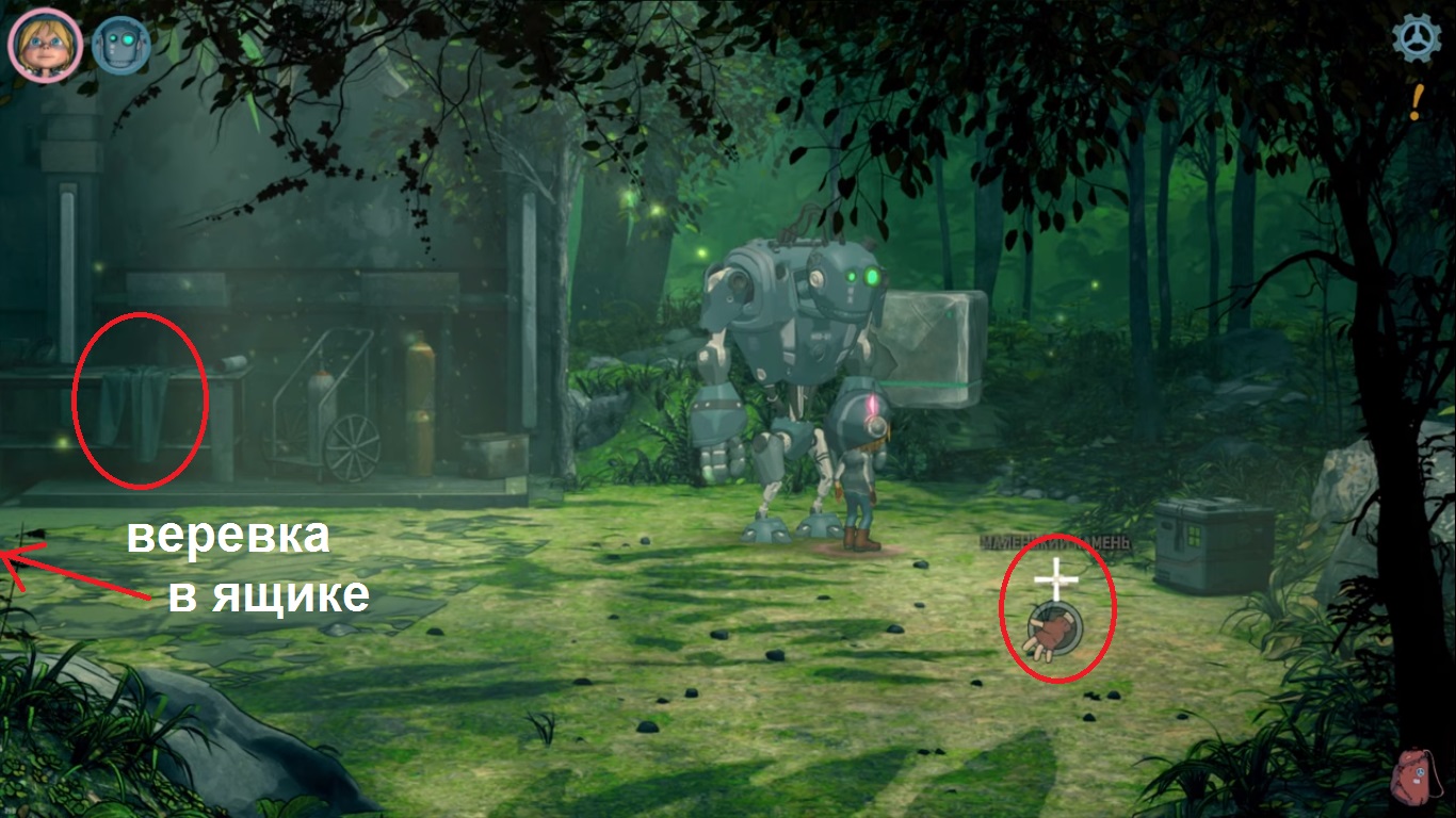 Дальше нужно идти к ручью, идите направо до тупика с мостом. Соедините веревку с ведром и пусть Тина почерпнет воду из ручья. Возвращайтесь к отцу и расскажите ему об успехе. Запустится кат-сцена, где все садятся кушать, но в это время приходит мэр в костюме большого робота с армией других роботов. Рен достает из земли устройство, но оно, к сожалению, не работает. И теперь вам нужно срочно помочь его починить. Придется найти: большую шестеренку, три больших камня и большую эластичную ленту.