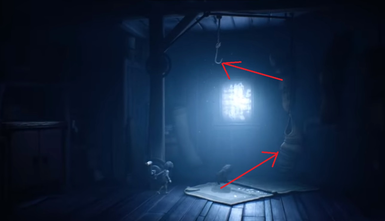 В комнате вы увидите засохший труп старухи или манекена, нужно потянуть за руку и вырвать у неё рычаг, потом вернуться к спутнику вправо. Он покрутит рычаг, и справа в комнате поднимется вверх кусок с вещами, нужно запрыгнуть на него и оттуда прыгнуть на крючок, чтобы достать ключ: