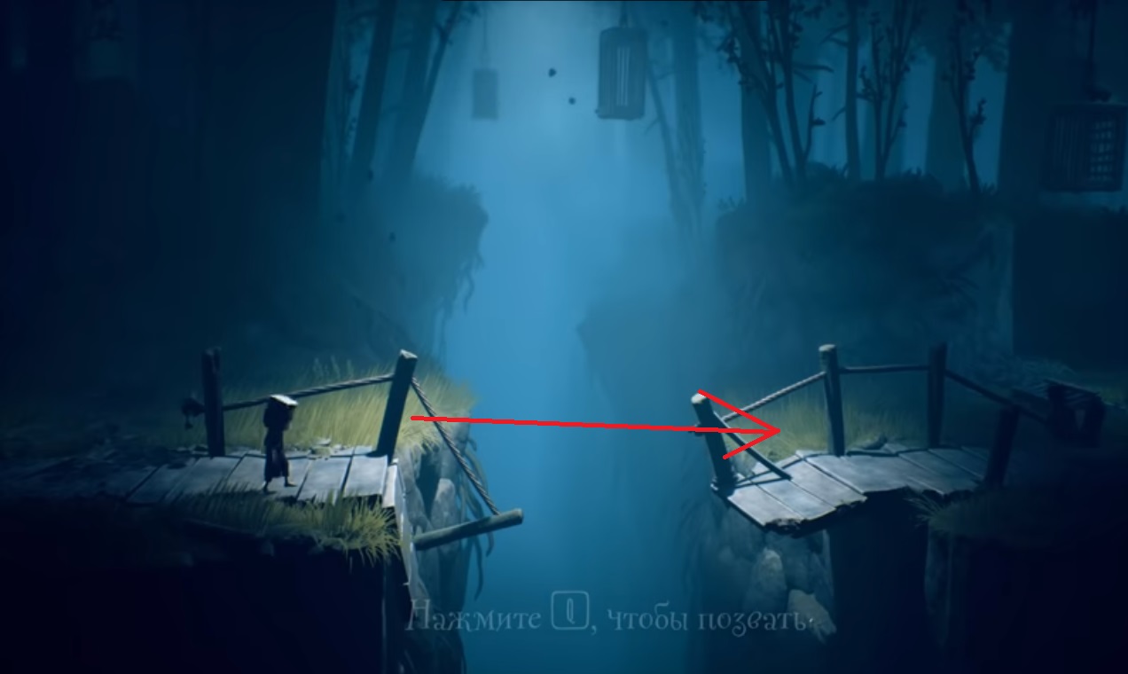 Ползите по норе вправо. Впереди будет мостик. Потяните за веревку, чтобы ваш спутник перепрыгнул на другую сторону, после чего нажмите Q, чтобы позвать его. Прыгайте только тогда, когда он подойдет, тогда он подаст вам руку, и вы сможете перепрыгнуть. Обязательно разбегитесь перед прыжком: