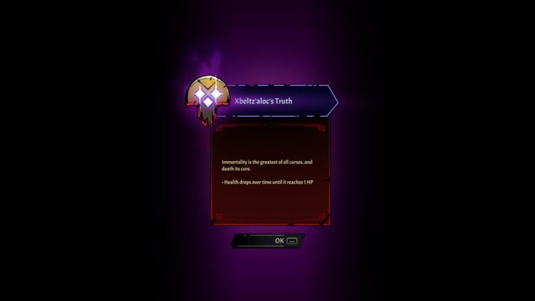 Когда четыре из вышеперечисленных проклятий будут получены, при зполнении шкалы на 100 процентов, пы получите пятое, “Xbeltz’aloc’s Truth”. Как только вы его получите, ваше здоровье будет постепенно уменьшаться до 1. Можно сказать, что это гонка на время, после которой ваш забег закончится.