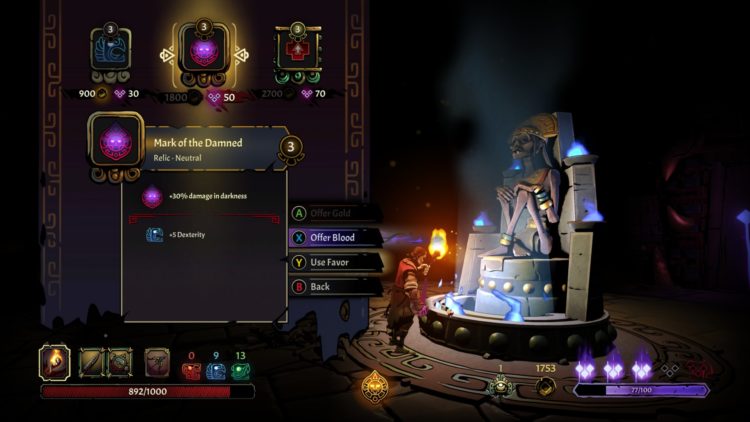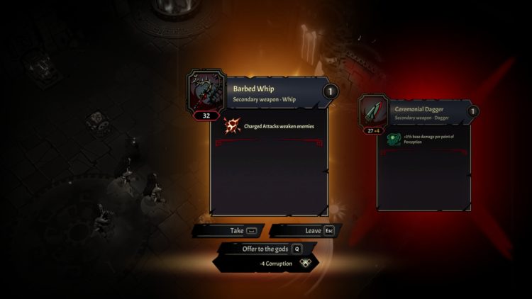Ни одна добыча не должна пропасть во время походов. Если вам не нужен конкретный дроп с моба, вы можете предложить его богам. Это может принести вам определенные награды, такие как исцеление, повышение атрибута или уменьшение порчи, которую вы заработали за свой долгий поход. Говорю сразу: вам не удастся снять порчу полностью (если только не победите Чемпиона Храма).