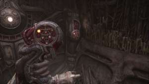 Отсюда вам нужно вернуться в место, где мы нашли вторую головоломку с замком. Для этого вернитесь к Мостовой Машине через лифт в комнату с большим красным организмом. Оказавшись внутри, используйте мостовую машину, чтобы перейти к проходу слева. Теперь вы вернулись в область со второй головоломкой с замком, поверните налево, чтобы найти панель управления с видом на внутреннюю часть машины моста.