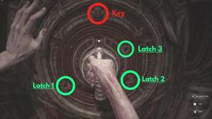 Выемки, в которые вам нужно поместить ключ, чтобы попасть в защелки, расположены на юго-западе, севере и юго-востоке. Верните ключ в центр и уберите его, когда выровняете все три. Теперь, когда отмычка снова обновлена, поверните направо и воспользуйтесь лифтом рядом с вами.