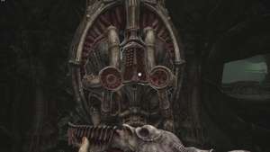 Вы войдете в зону с воротами справа от вас и панелью с болтовой винтовкой прямо перед вами. Достаньте винтовку и используйте её, чтобы активировать панель. Это откроет ворота. Пройдите через ворота и войдите в круглую область за ними. Следуйте по дорожке вокруг, и вы доберетесь до дверного проема. Пройдите через дверной проем, и вы столкнетесь лицом к лицу с новым монстром.