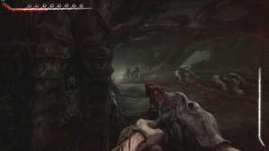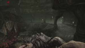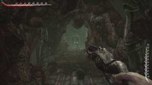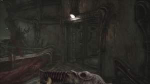Вернитесь к запертой двери и используйте ключ из плоти, чтобы открыть её. Спускайтесь по лестнице впереди. Внизу мы встретимся лицом к лицу с нашим первым настоящим врагом. Это неуклюжее существо (которое мы назовем ползучим плевателем) не представляет особой угрозы, хотя оно гораздо более живуче, чем парящие дроны, с которыми мы сталкивались ранее. Подойдите поближе и дважды выстрелите в голову, прежде чем отступить, чтобы перезарядить оружие.