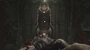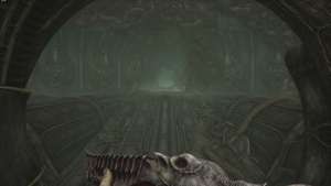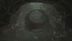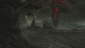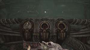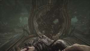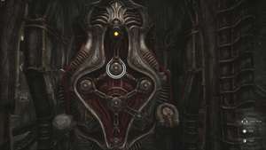 Когда будете готовы, идите в большую башню впереди. Вы окажетесь на нижнем этаже башни. В центре прохода впереди вы наткнетесь на панель управления. Используйте, чтобы заставить застрявшую тележку со сферой подняться из-под башни, пробив мясистые вены, блокирующие дверной проем справа от нас.