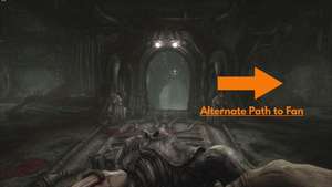 По пути вы найдете туннель слева от вас. Это приведет вас обратно в место, где мы модернизировали ключ из плоти. Поверните направо возле перил с видом на руины и пройдите через дыру в вентиляторе.