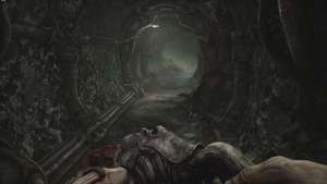 Продолжайте следовать по маршруту, и в конце концов вы придете к другому туннелю. Здесь на стенах ползают два плевака, хотя они упадут одним ударом при использовании болт-винтовки. Сбейте их и толкайте вперед.