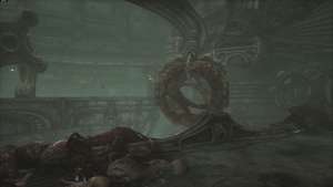 Чтобы улучшить свой ключ, спуститесь по центральному туннелю и следуйте по дорожке вокруг. Вы окажетесь на приподнятой дорожке с видом на ряд покрытых плотью руин.
