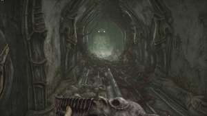 Выйдя из лифта, поверните налево, и вы найдете еще одну запертую дверь, которую наш ключ из плоти в настоящее время не может открыть. Нам нужно будет обновить его. Имея это в виду, вернитесь к лифту и поверните направо. Ищите панель болт-винтовки в конце пути. Экипируйте болтовую винтовку, используйте приспособление и наблюдайте, как оно открывает новый маршрут на пути под нами. Вы также разбудите ползучего плевка перед новым маршрутом, так что убейте его из пистолета, стоя на возвышении.