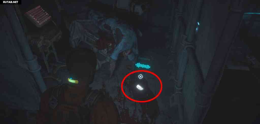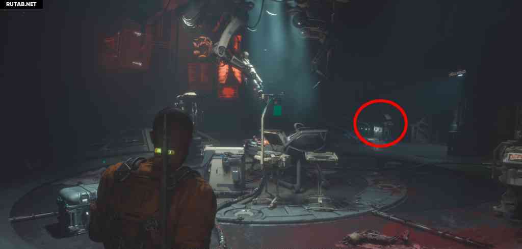 Автоматически по ходу сюжета, когда вы выполните задание Получить код от охранника. Вы должны поднять его, чтобы прогрессировать по сюжету. На трупе в комнате, где вы встречаете врагов с щупальцами.