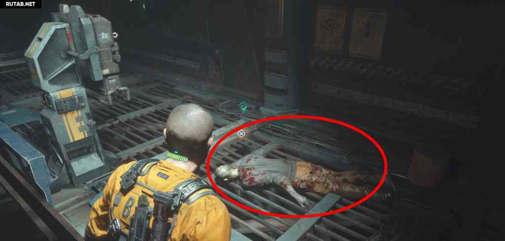 Поднимитесь обратно по лестнице. На этот раз пройдите через дверь технического обслуживания B414, которая ведет к двери медицинского отделения C101. Сразу после открытия двери в Медицинское отделение C101 этот труп лежит на полу перед вами.