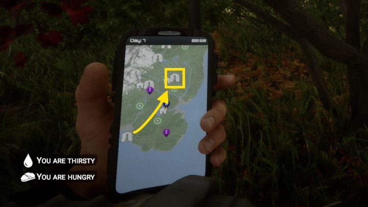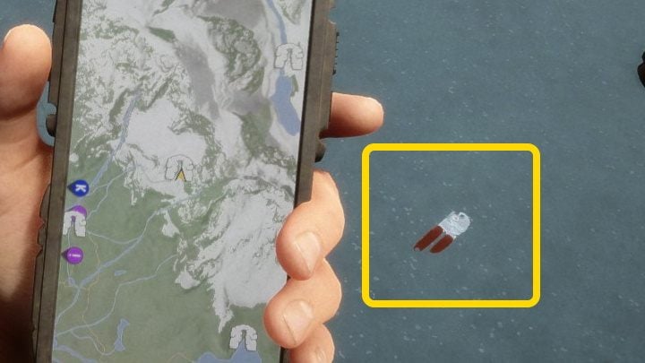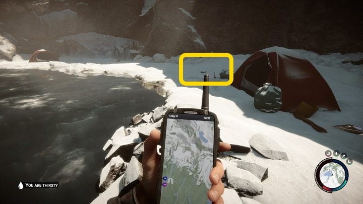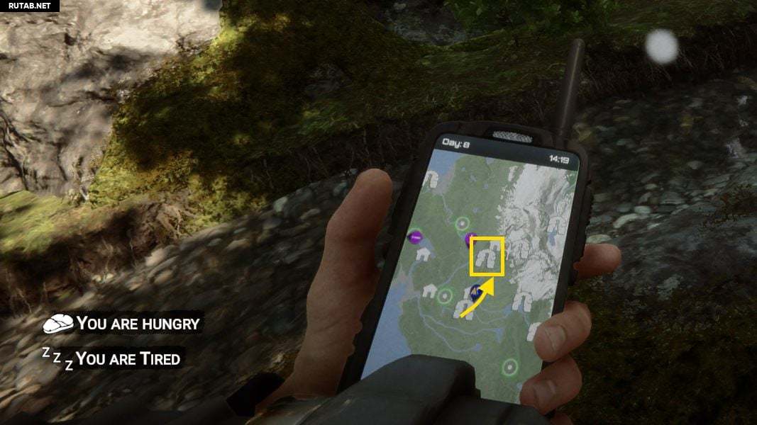 Бегите по скалам и поднимайтесь вверх. Вы найдете припасы и веревку, обернутую вокруг скалы. Ударьте по веревке своим топором, и тело упадет на землю. Вернитесь на землю, и вы можете обыскать тело, чтобы найти еще немного припасов. Вы также получите GPS-трекер, который вы можете разместить в любой точке мира, чтобы он служил маяком, к которому вы можете легко вернуться.
