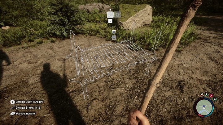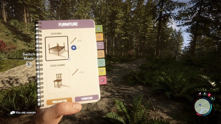 Выберите «Охотничье убежище» в меню «Строительство», затем разместите его где-нибудь рядом на земле. Вам понадобится 5 бревен, 6 палок и 7 камней. Вы можете получить бревна, срубив дерево, а затем разрубив его на бревна. Палки и камни можно найти на земле.