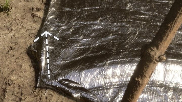 Войдите в свой инвентарь с помощью I и посмотрите направо. Возьмите брезент и положите его на землю. Затем возьмите палку и посмотрите вниз на брезент. Затем вы можете использовать палку, чтобы подпереть брезент и сделать очень простую палатку. Это позволит вам сохранить игру или поспать, пока мы строим хижину.