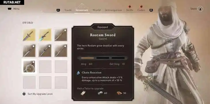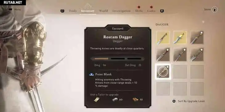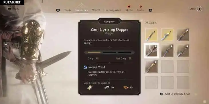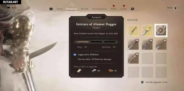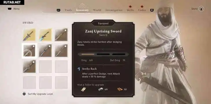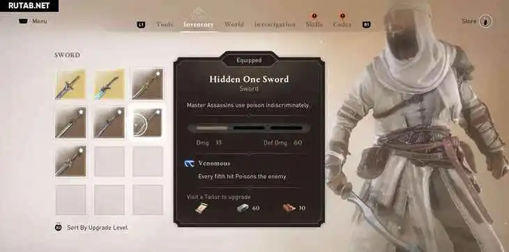 В Assassin's Creed Mirage есть 20 видов оружия (10 мечей и 10 кинжалов). Каждое оружие имеет пассивный эффект, повышающий боевые способности. Оружие можно улучшить у кузнеца. Чертежи улучшений можно получить из сундуков со снаряжением, а материалы можно купить у торговцев. Вы всегда одновременно владеете мечом и кинжалом. Кинжал используется для парирования входящих атак, а меч — для нанесения урона.