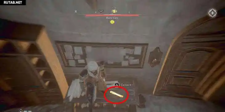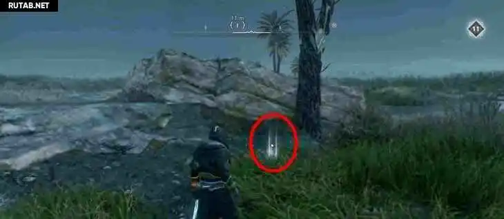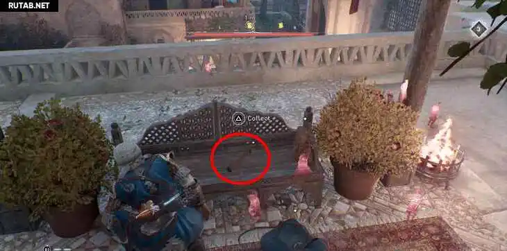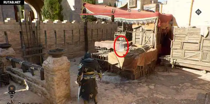 Этот находится внутри здания, рядом с которым находится водяное колесо. Двери заперты, чтобы попасть внутрь, вам нужно найти открытое окно и бросить в него метательный нож, чтобы попасть в зарешеченное окно. Тогда вы сможете залезть через окно и найти сокровище на первом этаже, в куче песка.