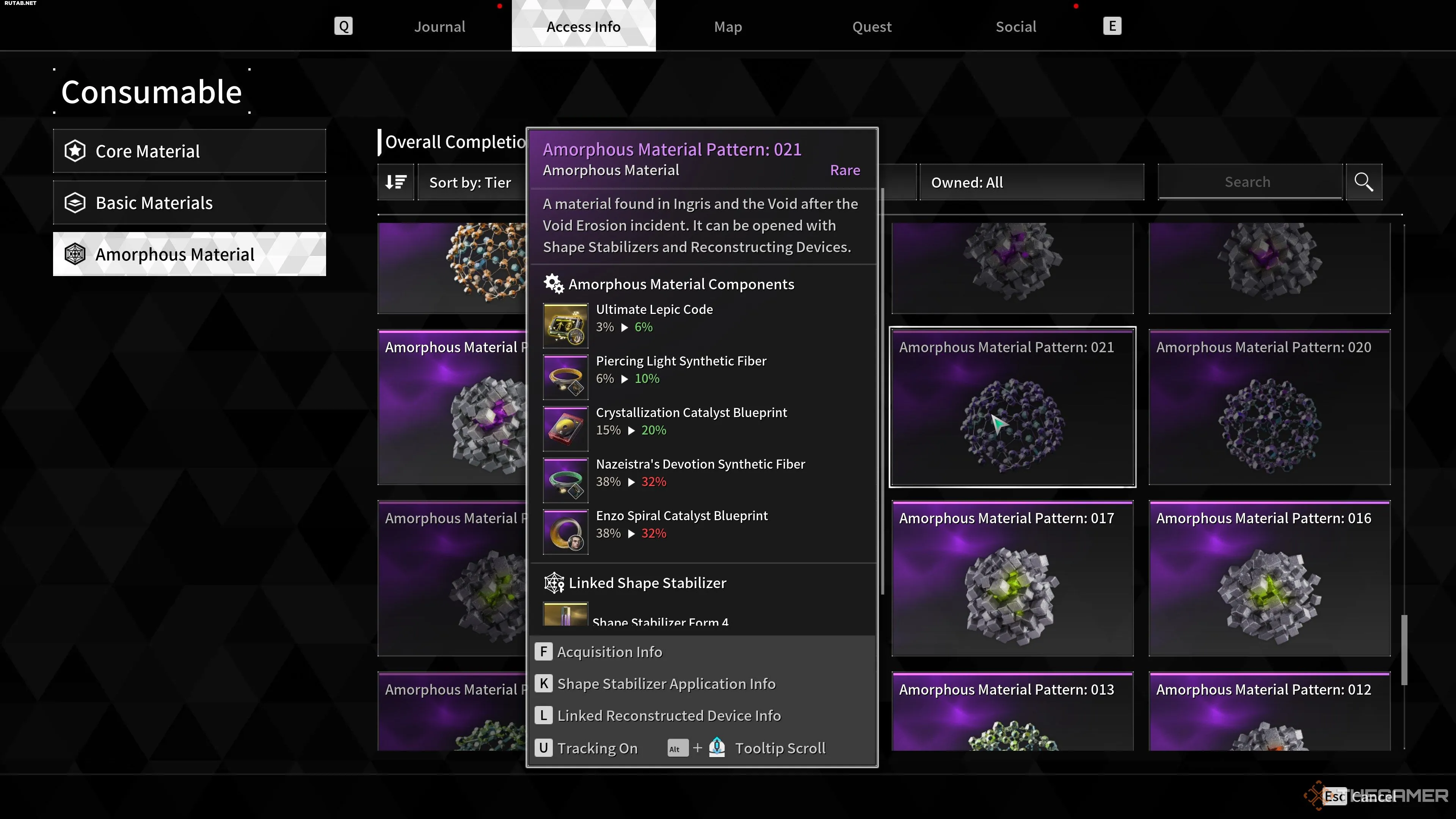 Как и в случае с аморфным материалом, стабилизаторы формы бывают разных видов. На момент запуска вы можете найти восемь типов стабилизаторов формы. Каждая версия может быть применена только к определенным типам Аморфных материалов, которые вы можете выяснить, проверив наличие у вас Аморфных материалов в меню снаряжения. Например, в таблице выпадения Аморфного материала 12 указано, что шансы выпадения редких предметов из него можно улучшить только с помощью Стабилизатора формы №2. Другие типы стабилизаторов с данным аморфным материалом не будут работать.