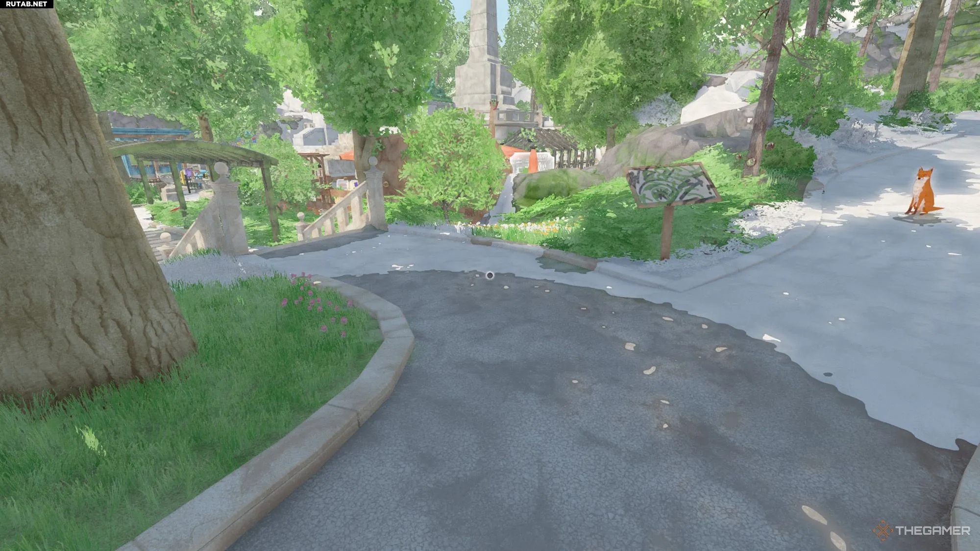 Оказавшись там, идите прямо и минуйте небольшую цилиндрическую конструкцию в центре. Добравшись до входа в отель, поверните направо и продолжайте движение прямо, чтобы найти дверь, ведущую в парковую зону. Оказавшись внутри парка, подойдите к беседке в центре и поверните направо. Спуститесь по лестнице и идите по тропинке, пока не увидите лису.