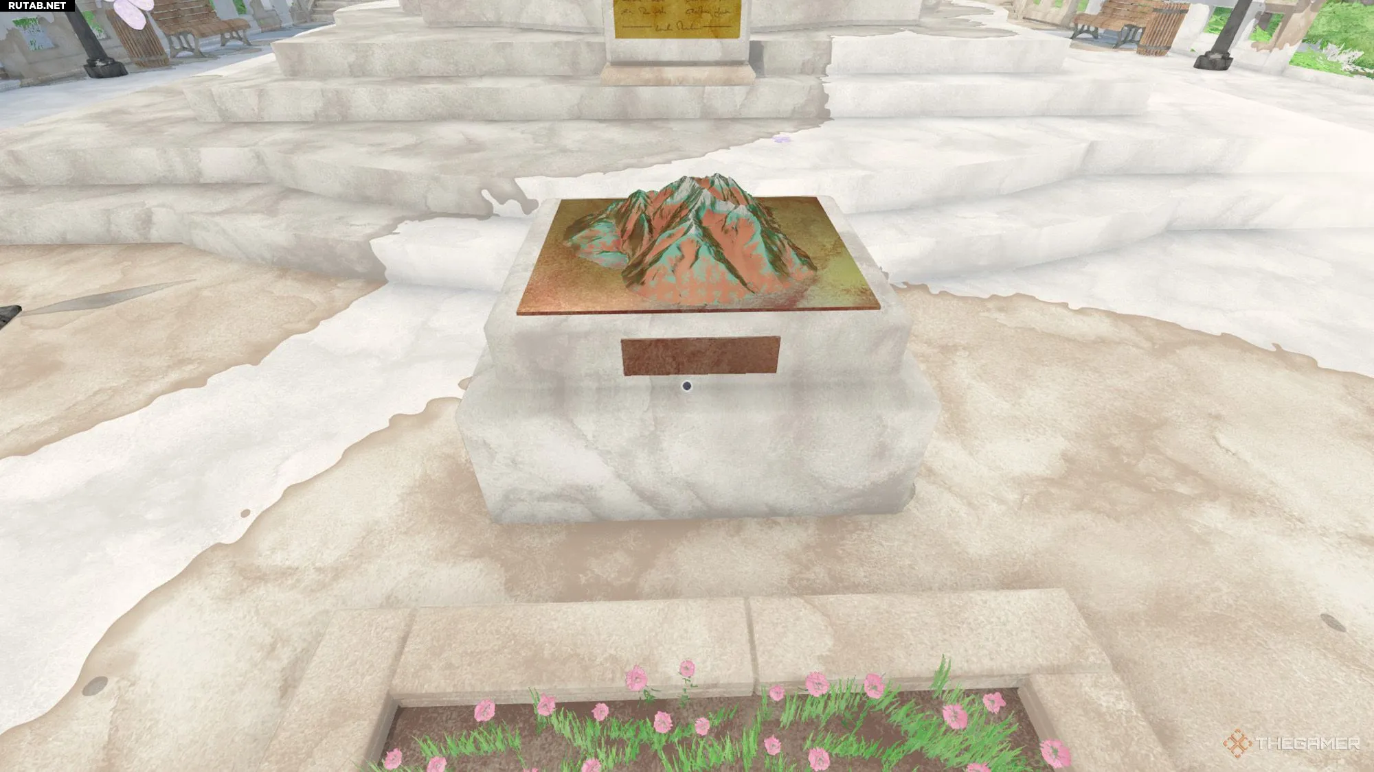 Прямо перед статуей ангела вы увидите небольшой камень с рельефной моделью горы. Когда вы нарисуете это, вы найдете гору и теперь сможете использовать этот штамп в своих картинах.