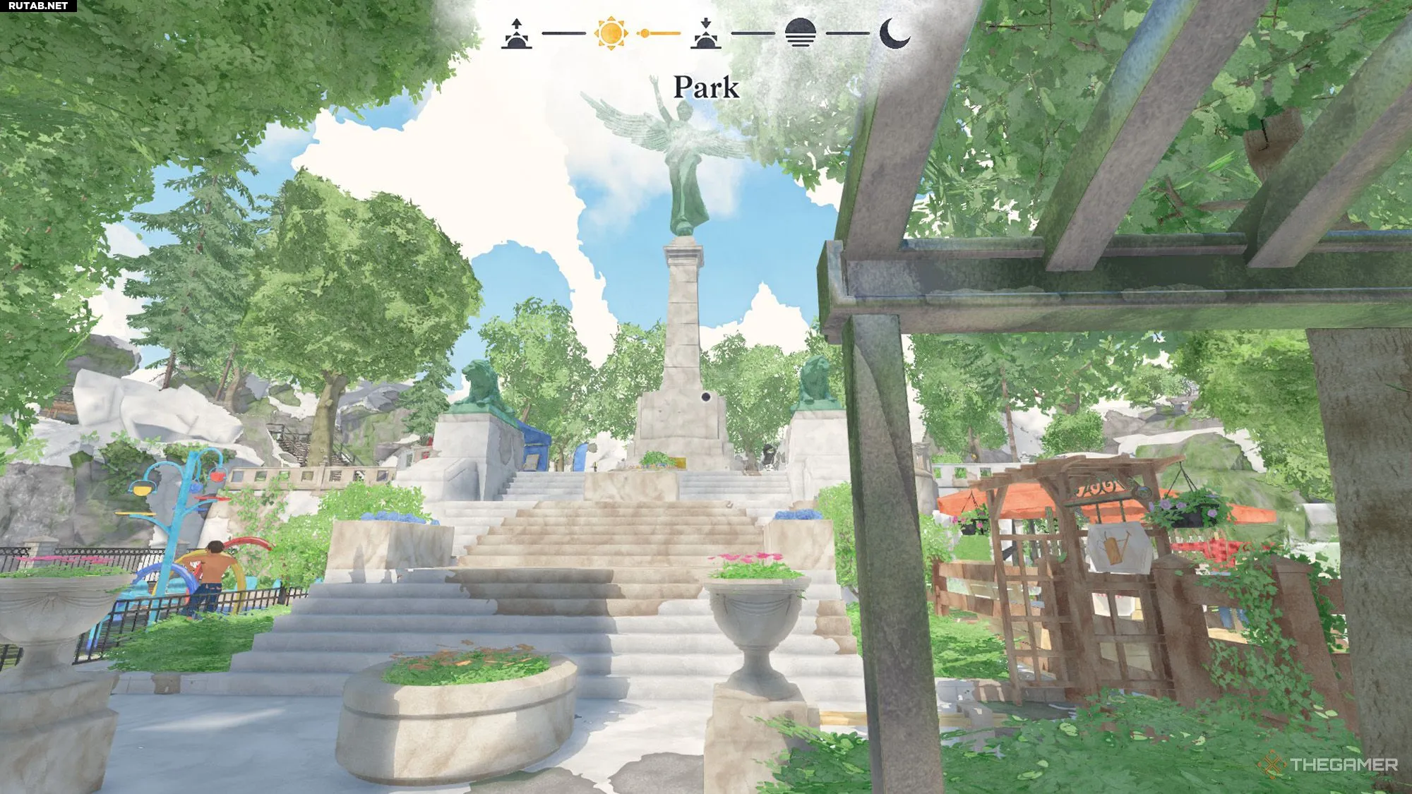Когда заметите лису, поверните налево. Спуститесь по лестнице и пройдите через обшитый деревянными досками проход. Когда доберетесь до места с велосипедной стойкой, поверните направо и увидите широкую лестницу между статуями львов. Поднимитесь по лестнице, чтобы добраться до большой статуи ангела.